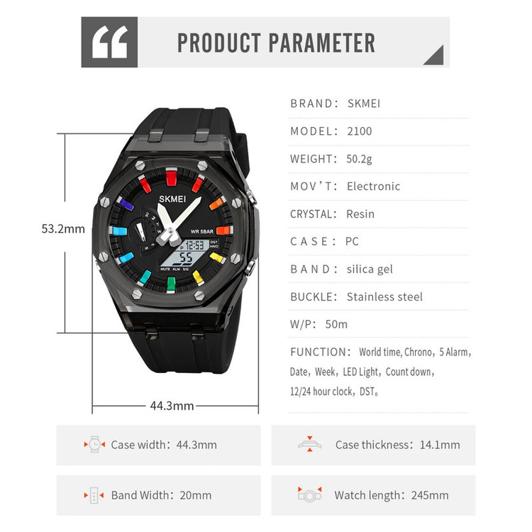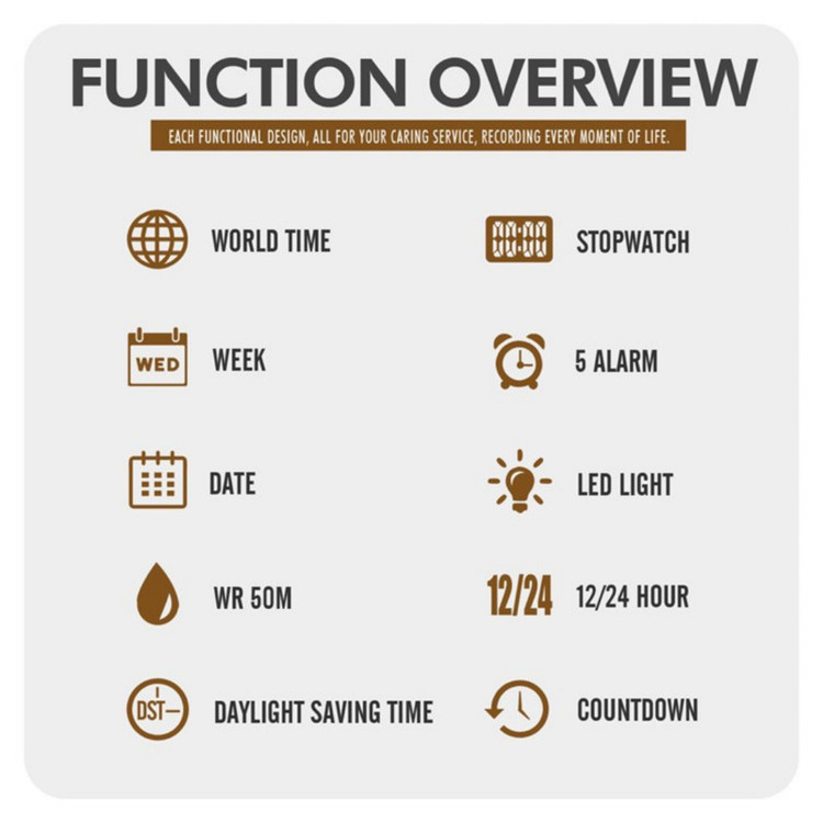 نمایش 24 ساعته , نمایش ساعت دوم , تاریخشمار , نور پسزمینه , آلارم , کرنوگراف
