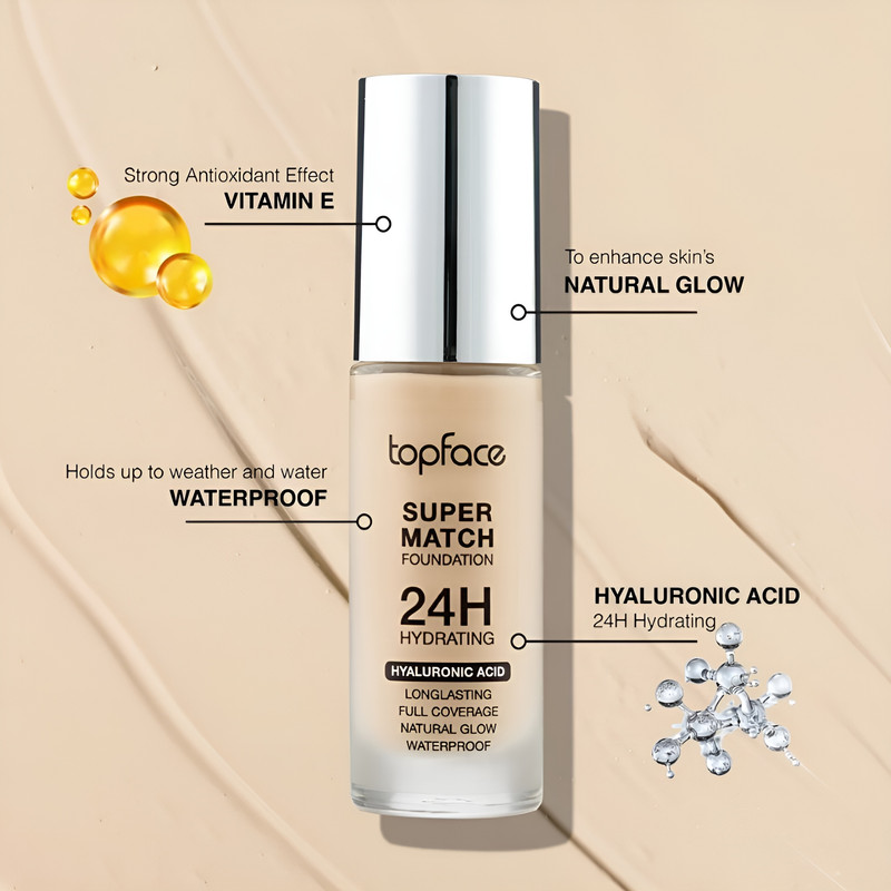 فول کاور حاوی ویتامین E و اثر آنتی اکسیدانی قوی اثر درخشش طبیعی و تقویت پوست ضد آب و تحمل شرایط سخت آب و هوایی حاوی هیالورونیک اسید و آبرسانی 24 ساعته پوست