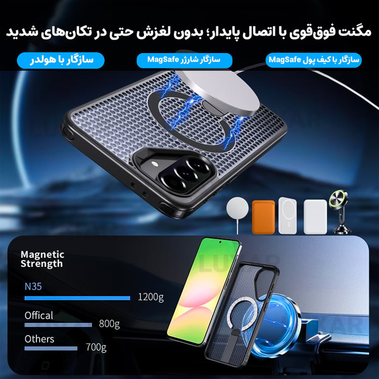 سازگار با هولدر - سازگار با شارژر MagSafe - سازگار با كيف يول MagSafe - استاندارد نظامى سقوط از ارتفاع 3متر