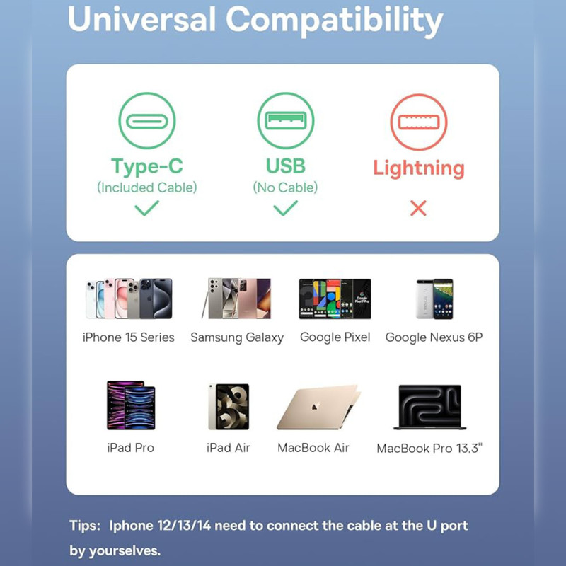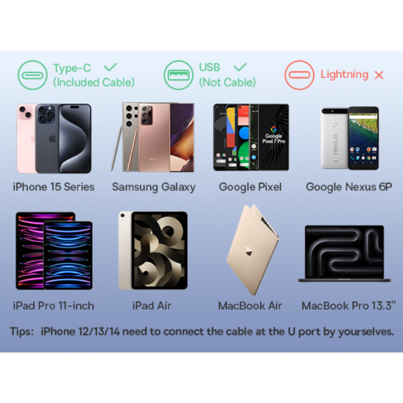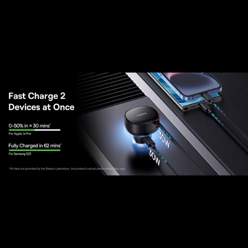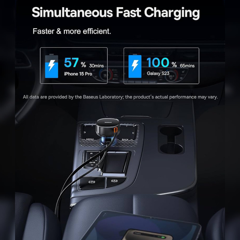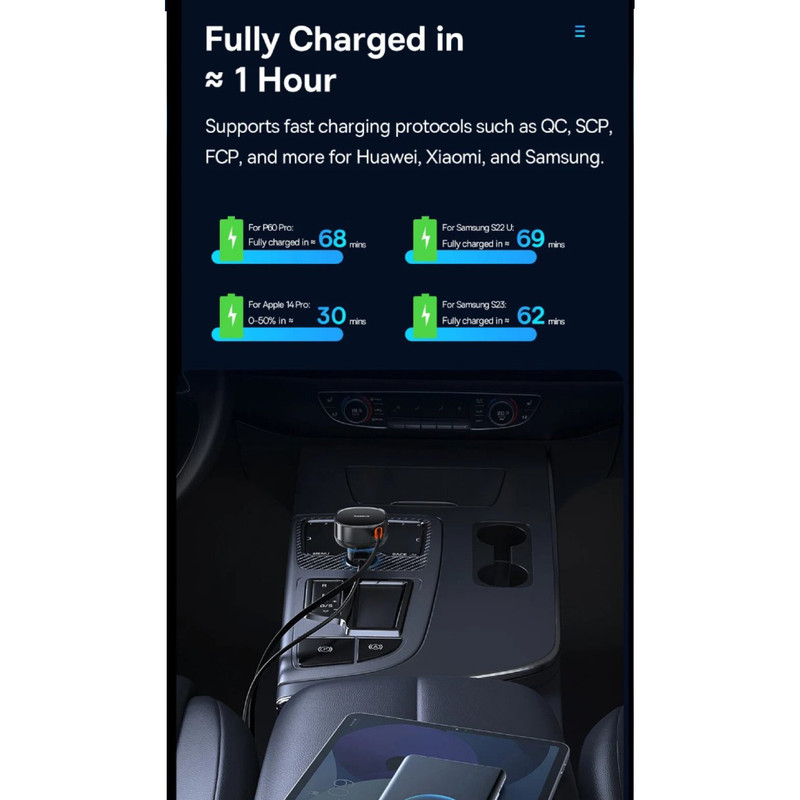 شارژر فندکی Enjoyment Pro برند بیسوس، دارای یک کابل تایپ سی متصل به بدنه و یک درگاه USB است که میتوانید همزمان دو دستگاه را با آن شارژ کنید. این شارژر فندکی از استانداردهای شارژ سریع PPS ،QC ،SCP ،FCP و Apple 20W PD سازگار با انواع گوشیهای برندهای مطرح از جمله اپل، سامسونگ، شیائومی، هوآوی و... را پشتیبانی میکند که حداکثر توان خروجی از هر دو پورت برابر با 30 وات است؛ همچنین این شارژر فست بیسوس، شارژ کامل گوشی سامسونگ S23 را در کمتر از 62 دقیقه و شارژ 50 درصدی گوشی آیفون 14 پرو را تنها در عرض 30 دقیقه انجام میدهد.