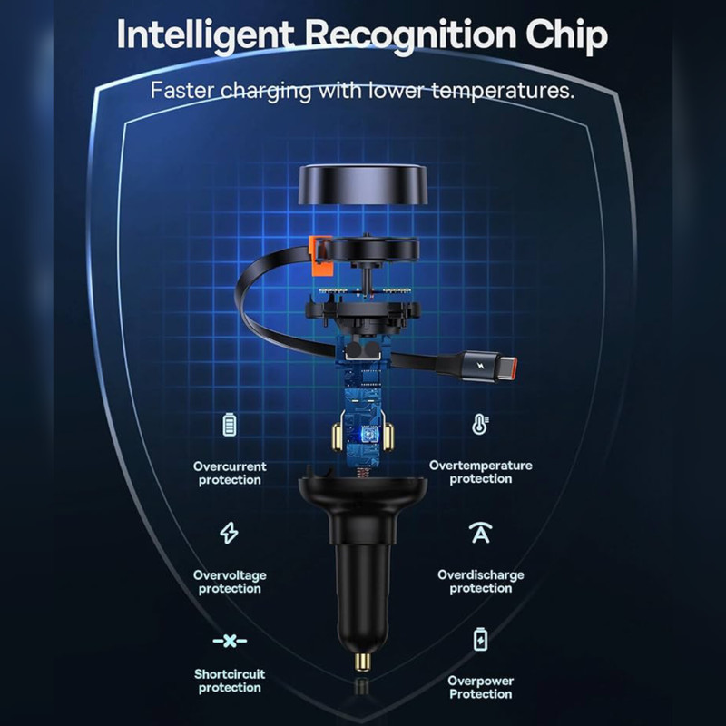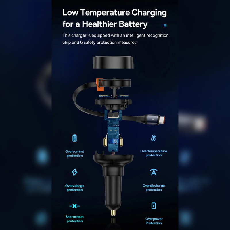 شارژر فندکی خودروی بیسوس به لطف داشتن تراشه هوشمند از دستگاههای در حال شارژ شدن شما در برابر شارژ بیش از حد، تغییرات شدت جریان، ولتاژ اضافی، اتصال کوتاه، تخلیه الکتریکی، دما و... محافظت میکند.