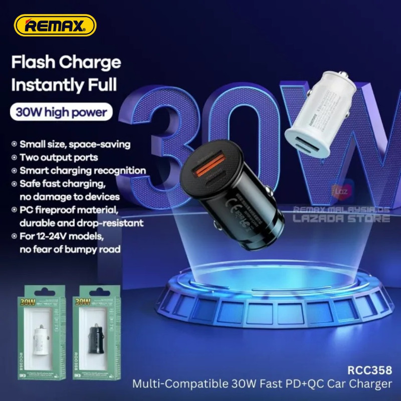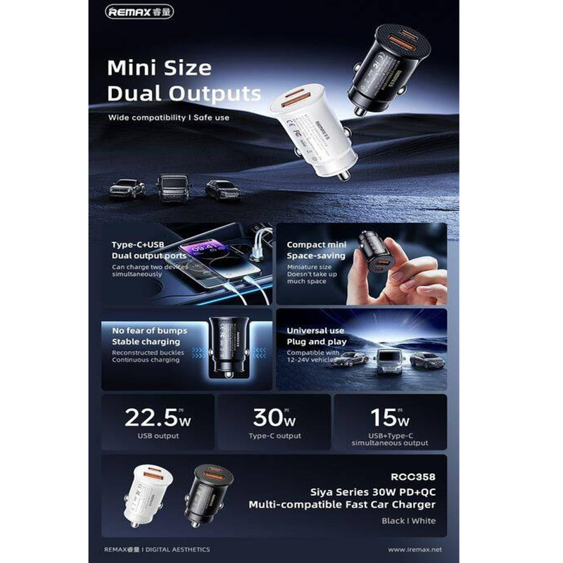 شارژر فندکی30وات ریمکس مدل RCC358-30W-PD+QC فست شارژ یکی از جدید مدلهای تولیدی توسط این برند می باشد که از تکنولوژی PD و QC برخوردار است و دارای دو پورت خروجی می باشد (یک USB و یک TYPE C) که خروجی تایپ سی آن 30 وات و خروجی USB آن 22.5 وات می باشد. این شارژر با ولتاژ 12 تا 24 ولت کار می کند که مناسبل استفاده در وسایل نقلیه سبک و سنگین می باشد.