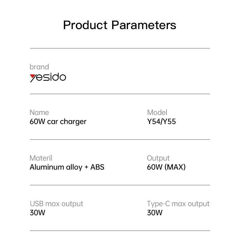 شارژر فندکی با کابل تایپسی به لایتنینگ مدل Y54 محصولی از یسیدو است. ابعاد این محصول کوچک و جمع و جور و تنها 4.5x2.2 سانتیمتر است. جنس بدنه محصول ساخته شده از آلیاژ الومینیوم و پلاستیک باکیفیت ABS + PC است. پورت های خروجی در این محصول 2 عدد است. یک پورت USB فست شارژ و یک پورت تایپسی 30 وات را داراست. این فندکی مجهز به یک چیپ هوشمند داخلی است که قادر است شدت جریان خروجی را منطبق بر دستگاه الکترونیکی هوشمند متصصله تنظیم نماید.گفتنی است این فندکی همراه یک کابل بسیار باکیفیت تایپسی به لایتنینگ ساخته شده از کارخانه یسیدو عرضه شده است.