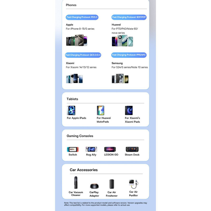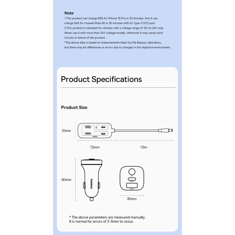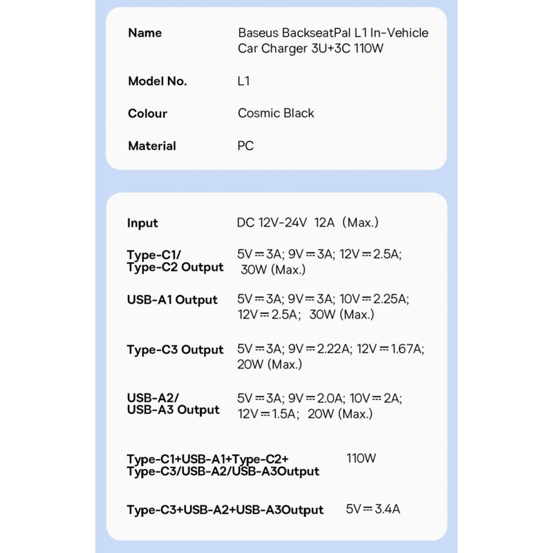 شارژر فندکی L1 دستگاهی کارآمد است که برای شارژ دستگاههای مختلف تلفن همراه در خودرو طراحی شده است. این شارژر از ورودی DC با حداکثر 12 ولت تا 24 ولت و 12 آمپر پشتیبانی میکند و چندین پورت خروجی از جمله Type-C و USB-A ارائه میدهد. پورتهای Type-C1 و Type-C2 حداکثر توان 30 وات را ارائه میدهند و از ولتاژهای 5 ولت 3 آمپر، 9 ولت 3 آمپر و 12 ولت 2.5 آمپر پشتیبانی میکنند. پورت USB-A1 از ولتاژهای 5 ولت 3 آمپر، 9 ولت 3 آمپر، 10 ولت 2.25 آمپر، 12 ولت 2.5 آمپر و همچنین تا 30 وات پشتیبانی میکند. پورت Type-C3 تا 20 وات توان با ولتاژهای 5 ولت 3 آمپر، 9 ولت 2.22 آمپر و 12 ولت 1.67 آمپر ارائه میدهد. علاوه بر این، پورتهای USB-A2 و USB-A3 حداکثر توان 20 وات را ارائه میدهند و از ولتاژهای مختلفی از جمله 5 ولت 3 آمپر، 9 ولت 2 آمپر، 10 ولت 2 آمپر، 12 ولت 1.5 آمپر پشتیبانی میکنند. همه پورتها روی هم رفته میتوانند تا 110 وات توان ارائه دهند که امکان شارژ همزمان چندین دستگاه را فراهم میکند. علاوه بر این، پورتهای Type-C3، USB-A2 و USB-A3 حداکثر جریان خروجی 5 ولت 3.4 آمپر را ارائه میدهند.