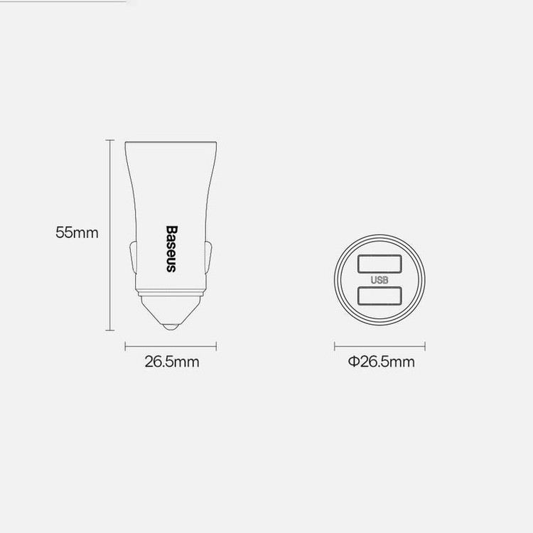 ابعاد شارژر فندکی بیسوس برابر با 55x26.5x26.5 میلی متر است.