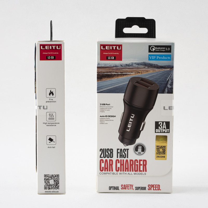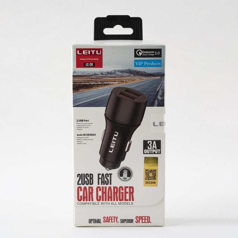 شارژر فندکی مدل LC-C8 یک شارژر با کیفیت که توسط شرکت LEITU ساخته شده است. شارژرهای فندکی یک راه رایج برای جلوگیری از تمام شدن شارژ باتری گجتهای هوشمند شما در طول روز و ساعاتی که به پریز برق دسترسی ندارید، محسوب میشوند. شما با استفاده از یک شارژر فندکی میتوانید باتری گوشیهای موبایل، دوربین دیجیتال، موزیک پلیر و دیگر دستگاههای از این قبیل خود را داخل خودرو، بدون نیاز به استفاده از پریز برق، شارژ کنید. شرکت لیتو این شارژر را با وزنی معادل 30 گرم طراحی کرده است. روی سطح این شارژر 2 درگاه خروجی USB تعبیه شده که شدتجریان خروجی در یکی از آنها 2.4. آمپر و دیگری تا 3 امپر است. ولتاز خروجی پورت های این دستگاه برابر 5V=2.4A ,5V=3A,9V=2A, 12V=1.5A میباشد توان خروجی کل این شارژر 18 وات بوده و میتواند ابزار دیجیتالی شما را به صورت سریع شارژکنند. این محصول با توجه به مجهز بودن به استانداردهای QC میتواند انواع گوشیهای موبایل و تبلت را هم بهراحتی شارژ کند. ولتاژ ورودی در این محصول 12 تا 24 ولت است. پس برای استفاده از آن کافی است شارژر را بهطور مستقیم به درگاه فندک داخل خودرو متصل کنید.به همراه این محصول یک کابل تبدیل لایتنینگ هم ارائه شده است که طول آن برابر با 1 متر است.