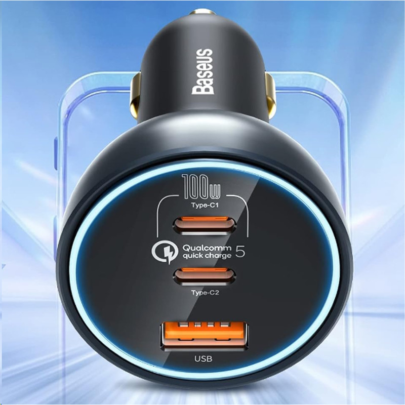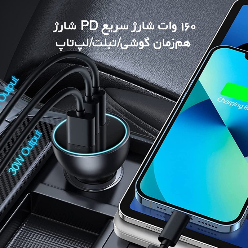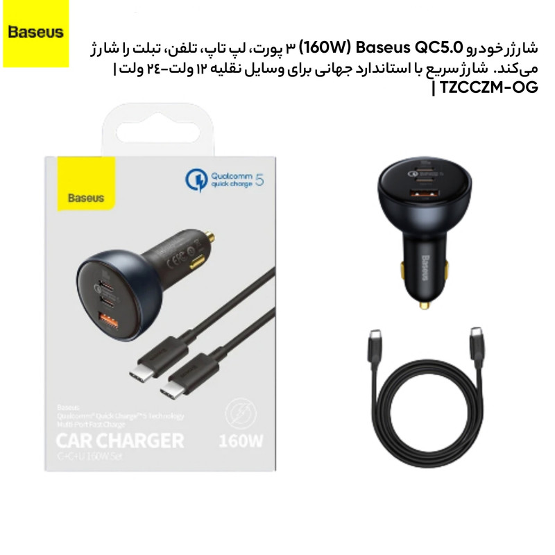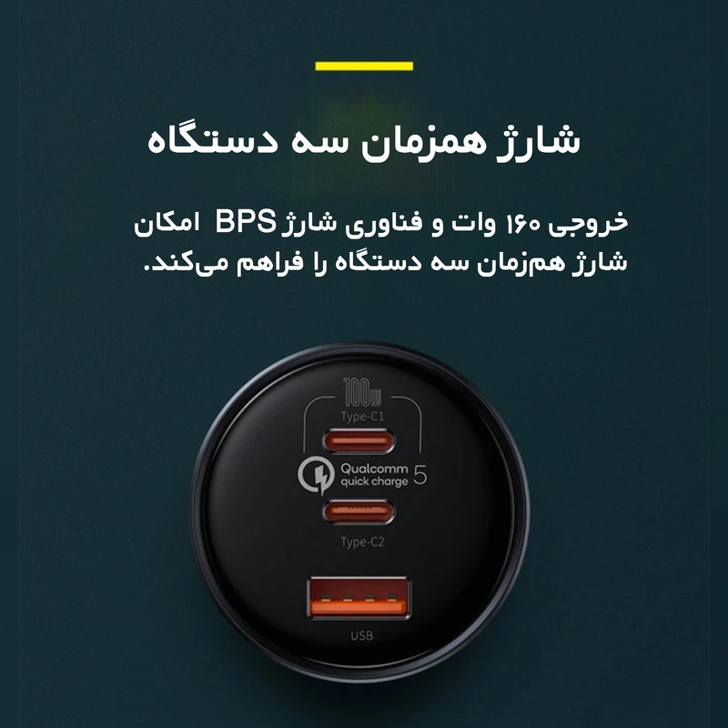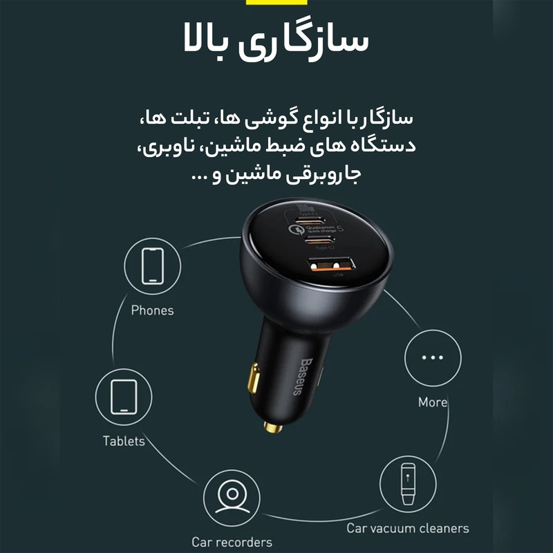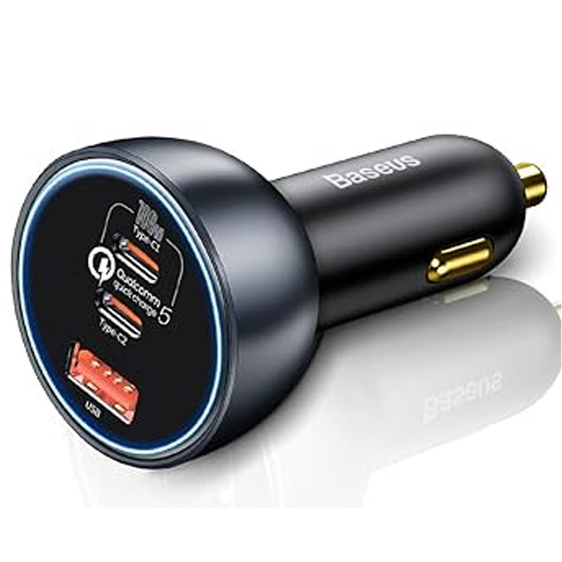 شارژر فندکی 3 پورت Baseus TZCCZM-0G Qualcomm 5 Fast Car Charger 160W : شارژ خالی کردن گوشی یکی از معضلات مسافرتهای جادهایست که معمولا با شارژر فندکی ماشین حل میشود. به همین دلیل خرید شارژری که دارای پورت های مناسب باشد کاملا لازم و ضروریست. شارژر فندکی ماشین بیسوس Baseus QC5.0 Dual Type C USB Car Charger دارای دو پورت فست شارژ تایپ سی و یک پورت فست یو اس بی است که از استانداردهای کوالکام بهره میبرند. توان خروجی کلی این شارژر 160 وات است و در صورت استفاده از یک پورت میتوانید تا 100 وات توان بگیرید. همراه این شارژر یک کابل 1 متری دو سر تایپ سی 100 واتی هم ارائه میشود که مدل Baseus Xiaobai بوده و میتوانید برای شارژ لپ تاپ از آن استفاده کنید. دارای 3 خروجی با توان بالا : همانطور که گفتیم روی بدنه شارژ فندکی Baseus TZCCZM-0G دو پورت Type C و یک پورت USB قرار دارد که میتوانید به طور همزمان از یکی برای شارژ لپ تاپ و از دیگری برای شارژ گوشی استفاده کنید. ورودی فندکی هم که به درگاه فندک ماشین وصل میشود و تقریبا با تمام ماشینهای 12-24V سازگاری خواهد داشت. در ادامه ولتاژ و جریان هر کدام از پورت ها و تکنولوژیهای فست شارژ به کار رفته در این دستگاه را نام میبریم: خروجی تایپ سی 1: 5V/3A | 9V/3A | 12V/3A | 15V/3A | 20V/5A - توان 100 وات خروجی تایپ سی 2: 5V/3A | 9V/2.22A | 12V/2.5A | 15V/2A | 20V/1.5A - توان 30 وات خروجی یو اس بی: 5V/3A | 9V/2A | 10V/2A | 12V/2.5A - توان 30 وات همه پورت ها با هم: 100 + 30 + 30 وات لازم به ذکر است که برای گرفتن خروجی 100 وات از پورت تایپ سی 1 بهتر است با همان کابل تایپ سی 100 وات که همراه محصول ارائه میشود لپ تاپ را شارژ کنید. به کمک این پورت شما میتوانید مک بوک پرو را در عرض 153 دقیقه کامل شارژ کنید. تکنولوژیهای فست شارژ : QC 5.0. شارژر ماشین بیسوس Baseus TZCCZM از استاندارد شارژ سریع کوالکام 5 با سه خروجی برخوردار شده است. این استاندارد نسب به نسل قبلی خود 70 درصد بهبود داشته و با همه نسخه های قدیمی هم سازگار است.