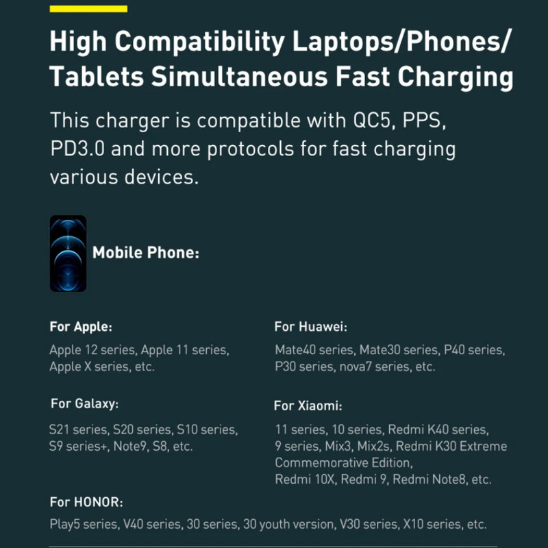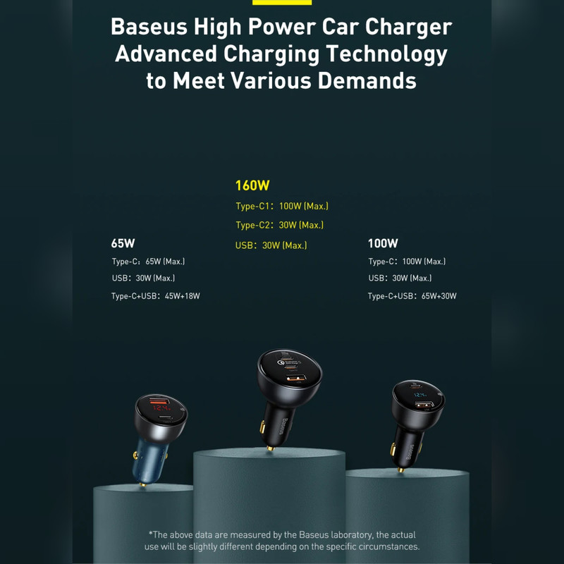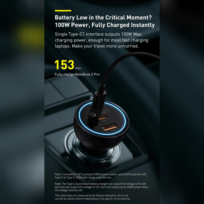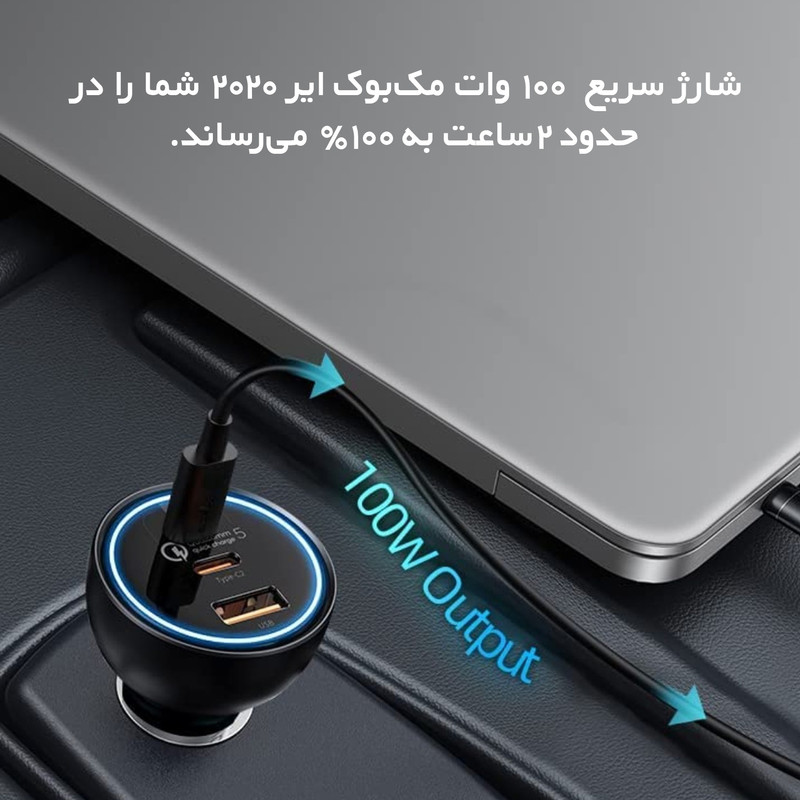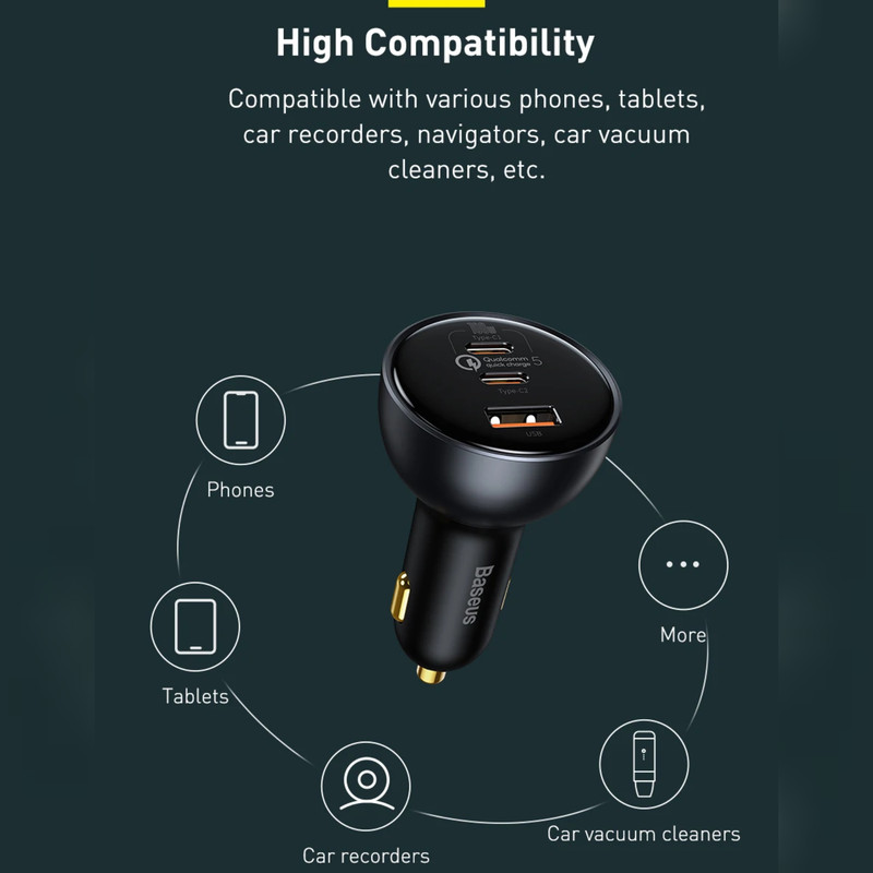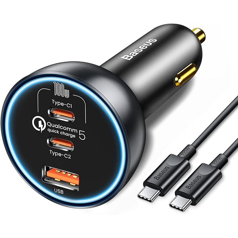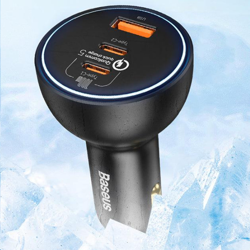شارژر فندکی 3 پورت Baseus TZCCZM-0G Qualcomm 5 Fast Car Charger 160W : شارژ خالی کردن گوشی یکی از معضلات مسافرتهای جادهایست که معمولا با شارژر فندکی ماشین حل میشود. به همین دلیل خرید شارژری که دارای پورت های مناسب باشد کاملا لازم و ضروریست. شارژر فندکی ماشین بیسوس Baseus QC5.0 Dual Type C USB Car Charger دارای دو پورت فست شارژ تایپ سی و یک پورت فست یو اس بی است که از استانداردهای کوالکام بهره میبرند. توان خروجی کلی این شارژر 160 وات است و در صورت استفاده از یک پورت میتوانید تا 100 وات توان بگیرید. همراه این شارژر یک کابل 1 متری دو سر تایپ سی 100 واتی هم ارائه میشود که مدل Baseus Xiaobai بوده و میتوانید برای شارژ لپ تاپ از آن استفاده کنید. دارای 3 خروجی با توان بالا : همانطور که گفتیم روی بدنه شارژ فندکی Baseus TZCCZM-0G دو پورت Type C و یک پورت USB قرار دارد که میتوانید به طور همزمان از یکی برای شارژ لپ تاپ و از دیگری برای شارژ گوشی استفاده کنید. ورودی فندکی هم که به درگاه فندک ماشین وصل میشود و تقریبا با تمام ماشینهای 12-24V سازگاری خواهد داشت. در ادامه ولتاژ و جریان هر کدام از پورت ها و تکنولوژیهای فست شارژ به کار رفته در این دستگاه را نام میبریم: خروجی تایپ سی 1: 5V/3A | 9V/3A | 12V/3A | 15V/3A | 20V/5A - توان 100 وات خروجی تایپ سی 2: 5V/3A | 9V/2.22A | 12V/2.5A | 15V/2A | 20V/1.5A - توان 30 وات خروجی یو اس بی: 5V/3A | 9V/2A | 10V/2A | 12V/2.5A - توان 30 وات همه پورت ها با هم: 100 + 30 + 30 وات لازم به ذکر است که برای گرفتن خروجی 100 وات از پورت تایپ سی 1 بهتر است با همان کابل تایپ سی 100 وات که همراه محصول ارائه میشود لپ تاپ را شارژ کنید. به کمک این پورت شما میتوانید مک بوک پرو را در عرض 153 دقیقه کامل شارژ کنید. تکنولوژیهای فست شارژ : QC 5.0. شارژر ماشین بیسوس Baseus TZCCZM از استاندارد شارژ سریع کوالکام 5 با سه خروجی برخوردار شده است. این استاندارد نسب به نسل قبلی خود 70 درصد بهبود داشته و با همه نسخه های قدیمی هم سازگار است.