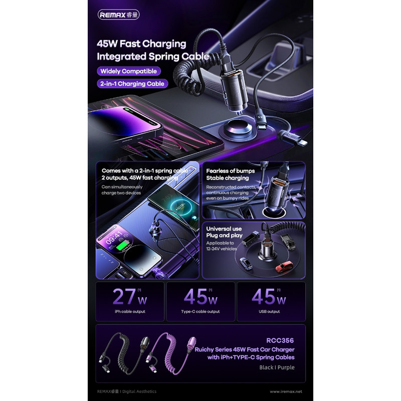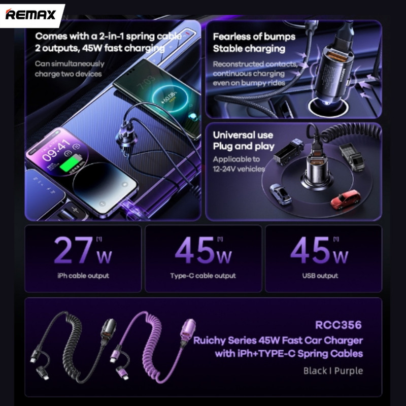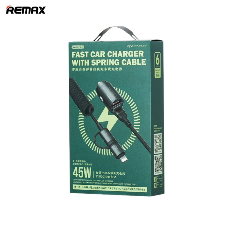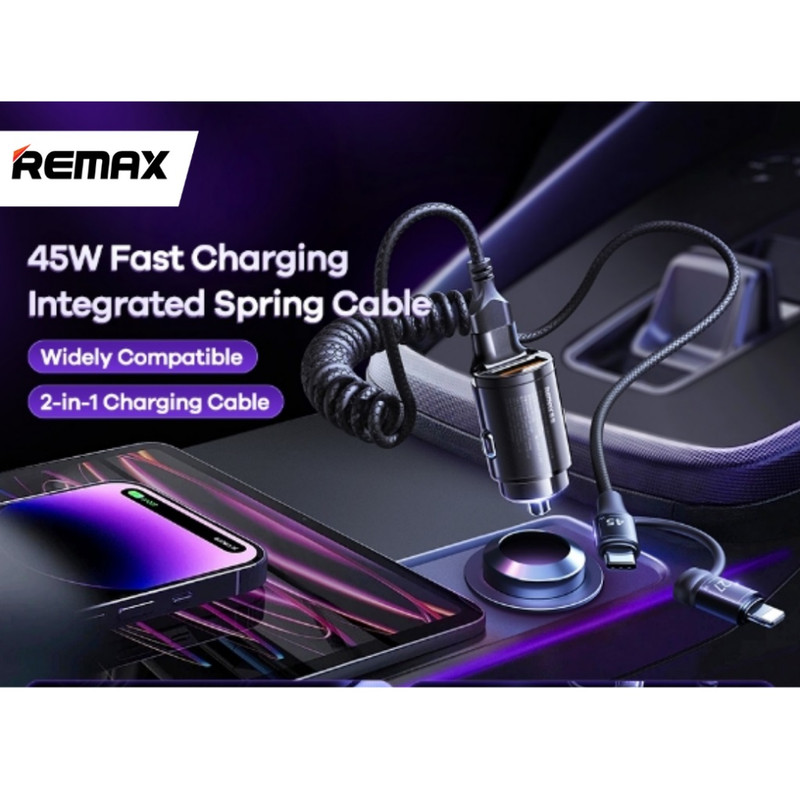 شارژر فندکی خودرو 45 وات ریمکس جدیدترین محصول ریمکس به تازگی وارد بازار شده است این محصول به همراه کابل شارژر عرضه شده است که دو سر نوع c و لایتنینگ را در خود دارد و شما را بی نیاز از تعویض کابل می کند . از مشخصات این کابل می توان به اندازه جمع و جور، صرفه جویی در فضا اشاره کرد همچنین قدرت بالای و فست شارژ بودن آن