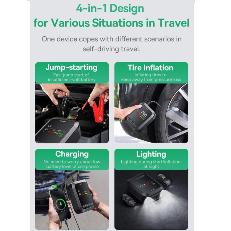 روش استفاده: جامپ استارتر / تنظیم باد لاستیک / چراغ قوه / پاوربانک گوشی و لپتاب