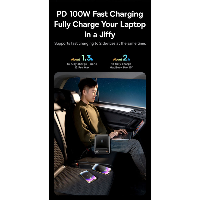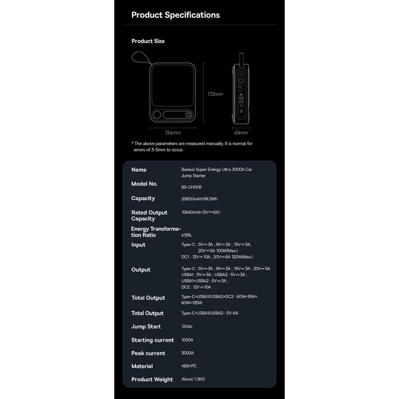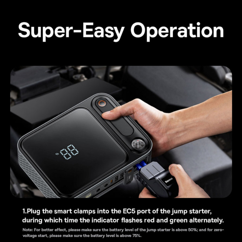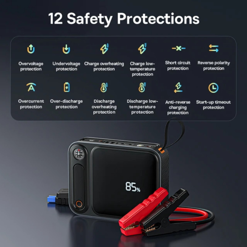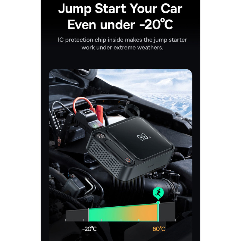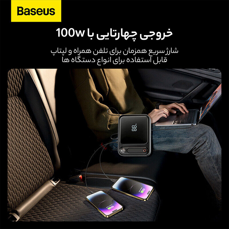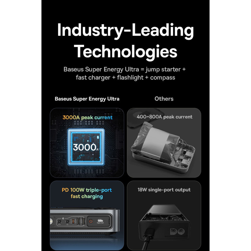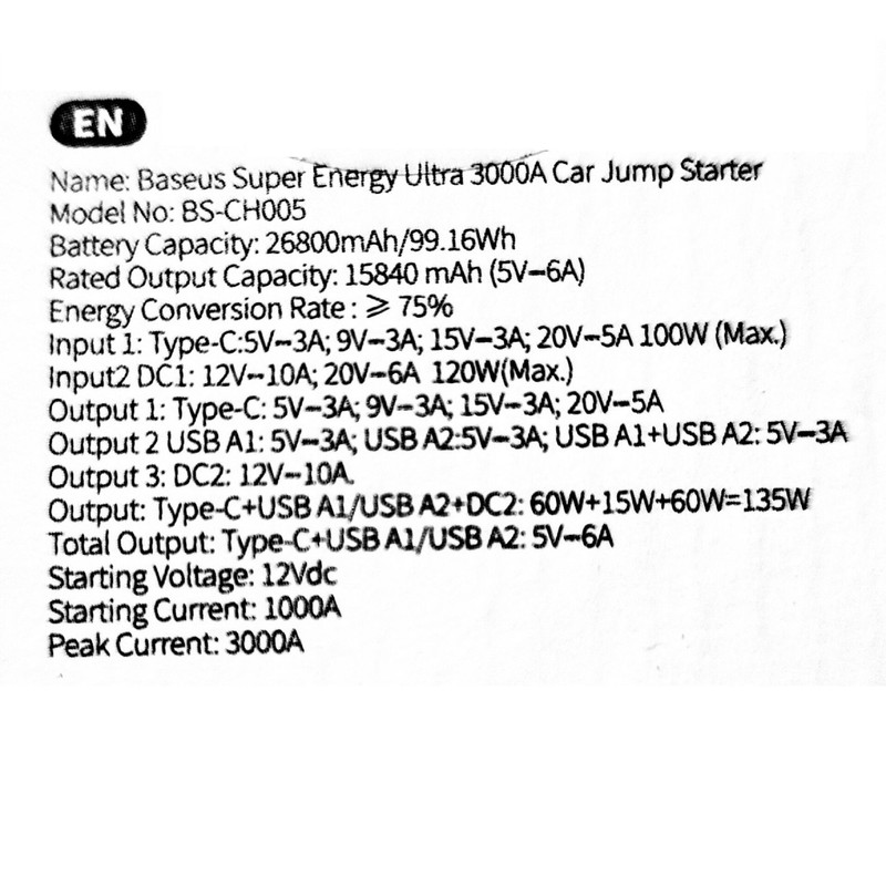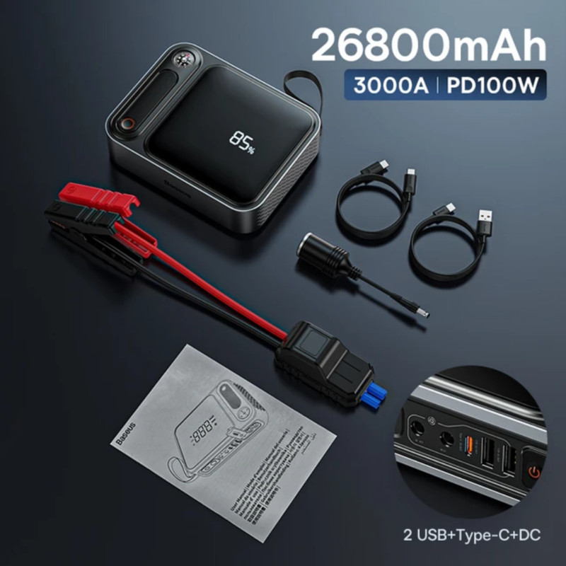 C00251400111-00 Baseus Super Energy Ultra 3000A یک دستگاه چند منظوره است که می توان از آن برای راه اندازی خودرو، شارژ دستگاه های الکترونیکی و به عنوان چراغ قوه اضطراری و قطب نما استفاده کرد. در اینجا برخی از ویژگی های کلیدی آن آورده شده است:
