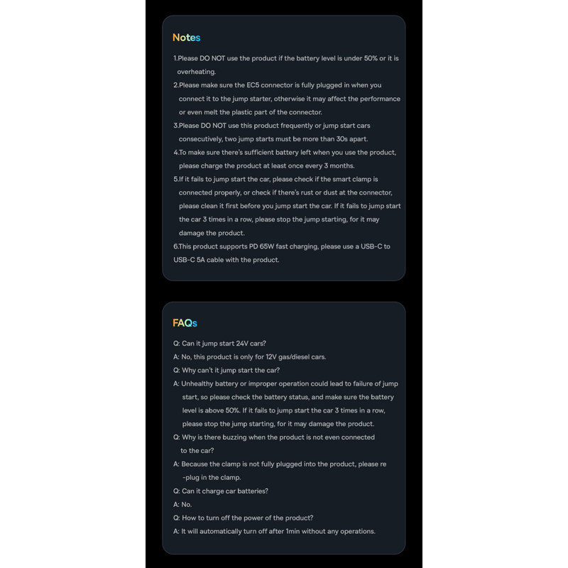 باتری لیتیوم یونی 26800 میلی آمپر ساعت: ظرفیت باتری بزرگ می تواند چندین راه اندازی را فراهم کند و همچنین دستگاه های الکترونیکی را برای مدت زمان طولانی تغذیه کند.