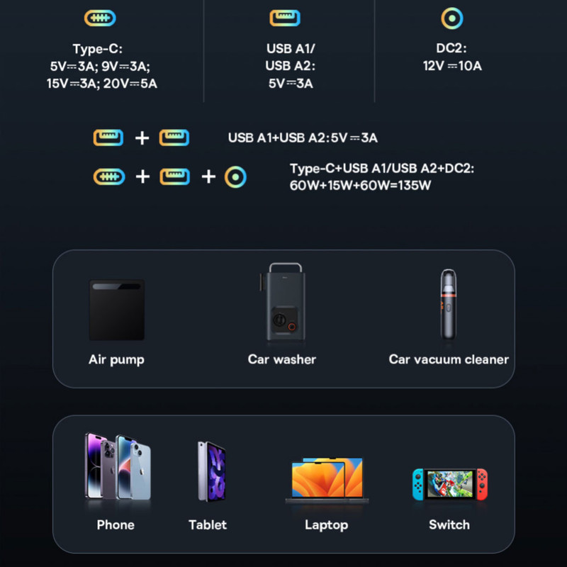 سه پورت USB: دو پورت USB-A با خروجی حداکثر 5V/3A و یک پورت USB-C با خروجی حداکثر 100W به شما امکان می دهد طیف وسیعی از دستگاه ها را شارژ کنید، از جمله تلفن های هوشمند، تبلت ها، لپ تاپ ها و حتی ابزارهای برقی.