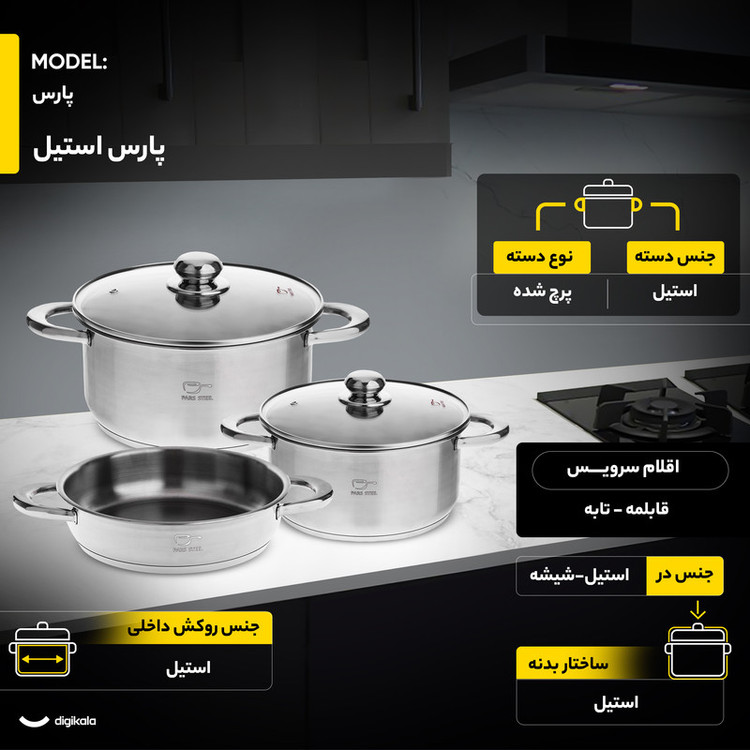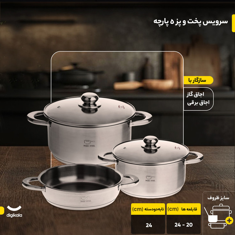 وزن ظروف: قابلمه سایز ۲۰: 1375 گرم - قابلمه سایز ۲۴: 1935 گرم- تابه سایز ۲۴: 1780 گرم