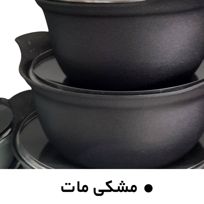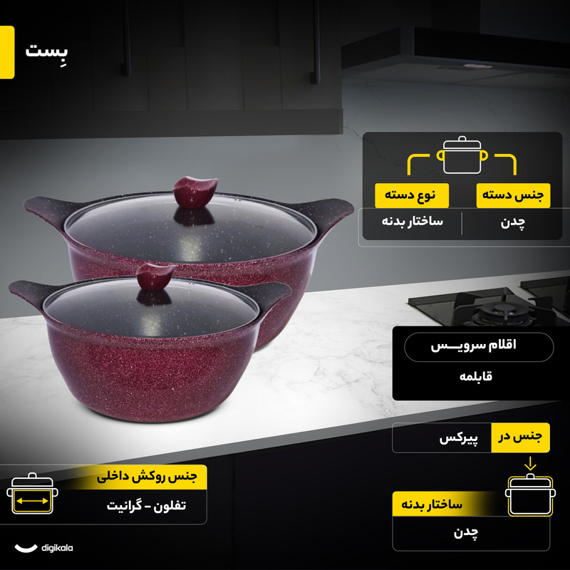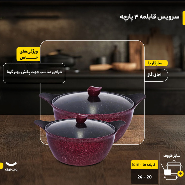 وزن ظروف: قابلمه سایز ۲۰: 1025 گرم، قابلمه سایز ۲۴: 1465 گرم