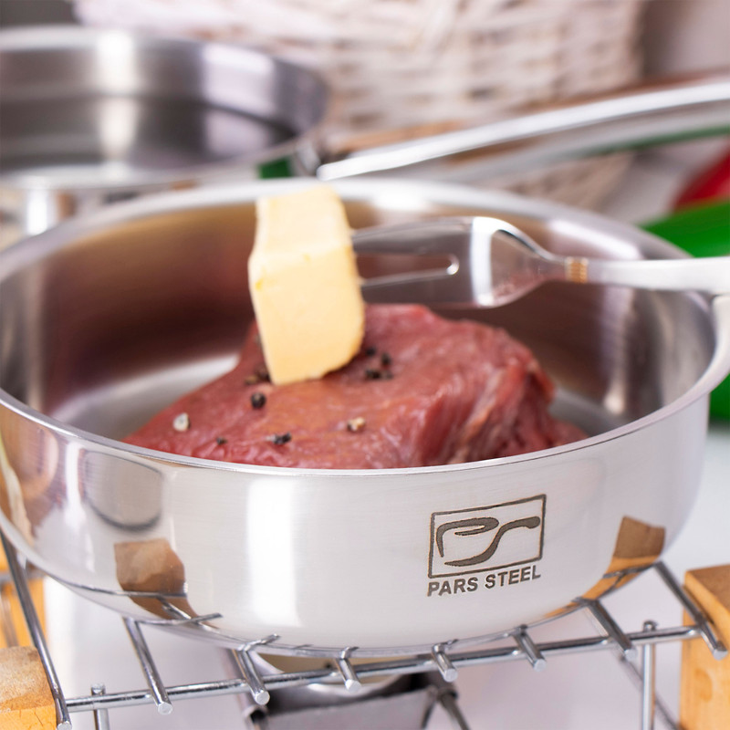 - استیل ضد خط و خش - کفه سه لایه آلومینیومی جهت جلوگیری از چسبندگی و سوختن غذا - قابل استفاده در فر - قابل شستشو در ماشین ظرفشویی