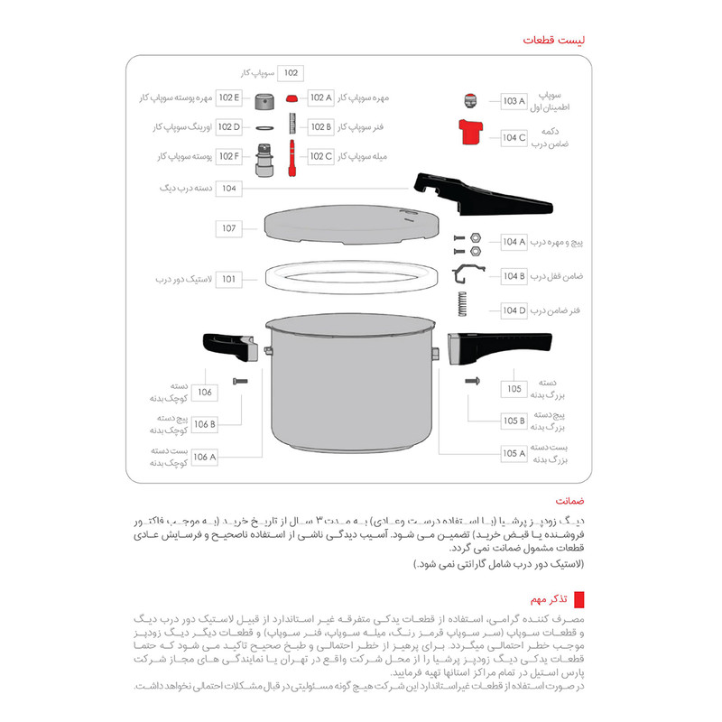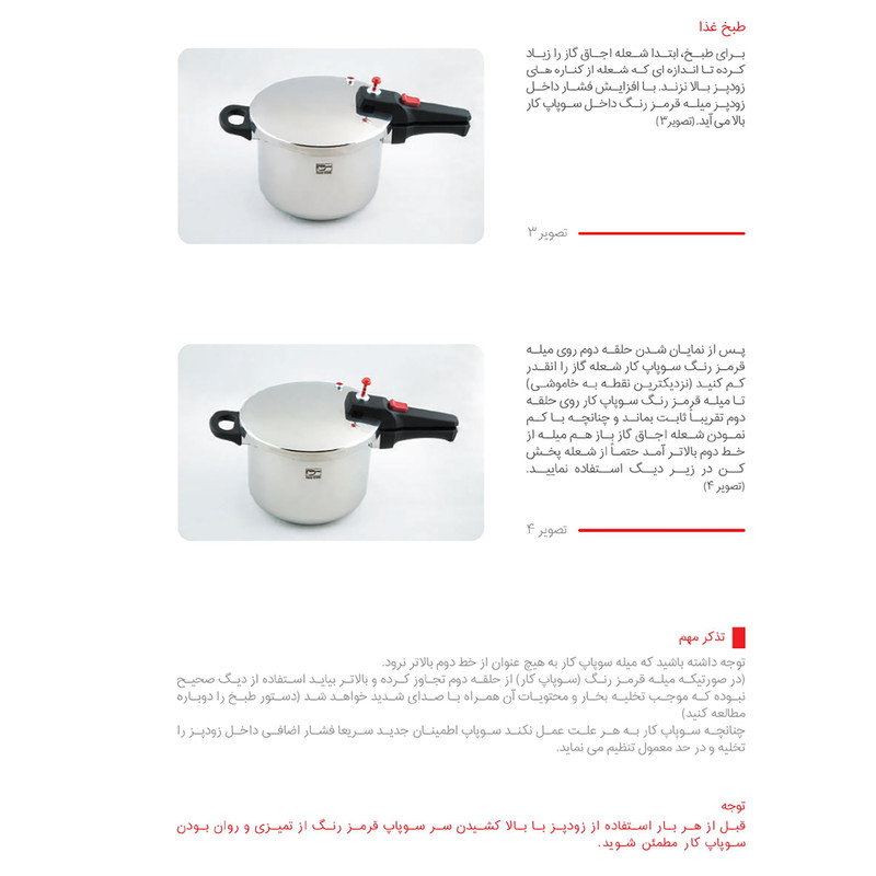 - استیل ضد خط و خش - کفه سه لایه آلومینیومی جهت جلوگیری از چسبندگی و سوختن غذا - سه سیستم تخلیه فشار جهت تامین حداکثر ایمنی - دارای ضامن روی دسته جهت باز و بسته نمودن درب - دارای نشان روی درب بهمنظور آسان باز و بسته نمودن در - قابل شستشو در ماشین ظرفشویی