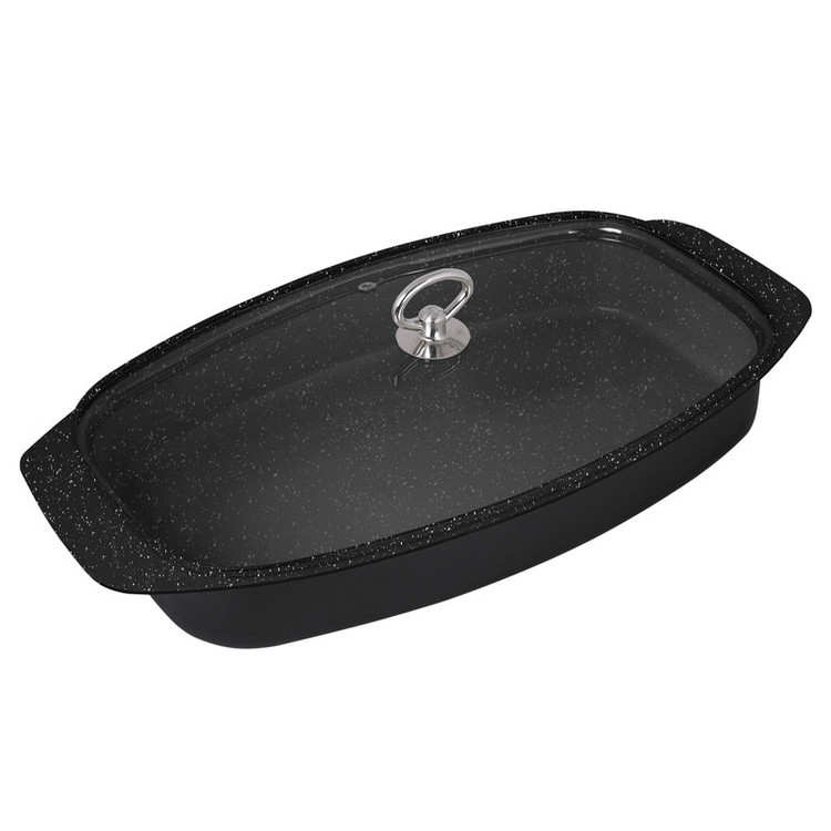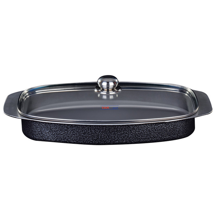جنس رویه گرانیت آلمان با خاصیت ضد سایش میباشد. تابه فر سایز 40 سانتیمتر وزن 2000 گرم ابعاد:6x25x46 همراه با درب پیرکس