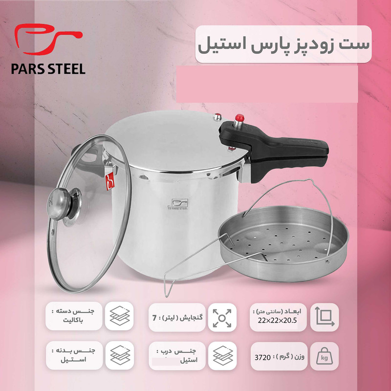 ویژگی زودپز: سبد بخارپز , در پیرکس , کف سه لایه , دستگیره بلند
