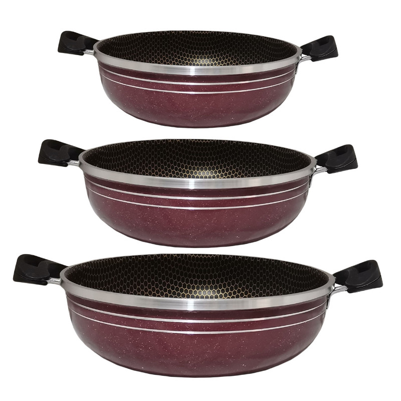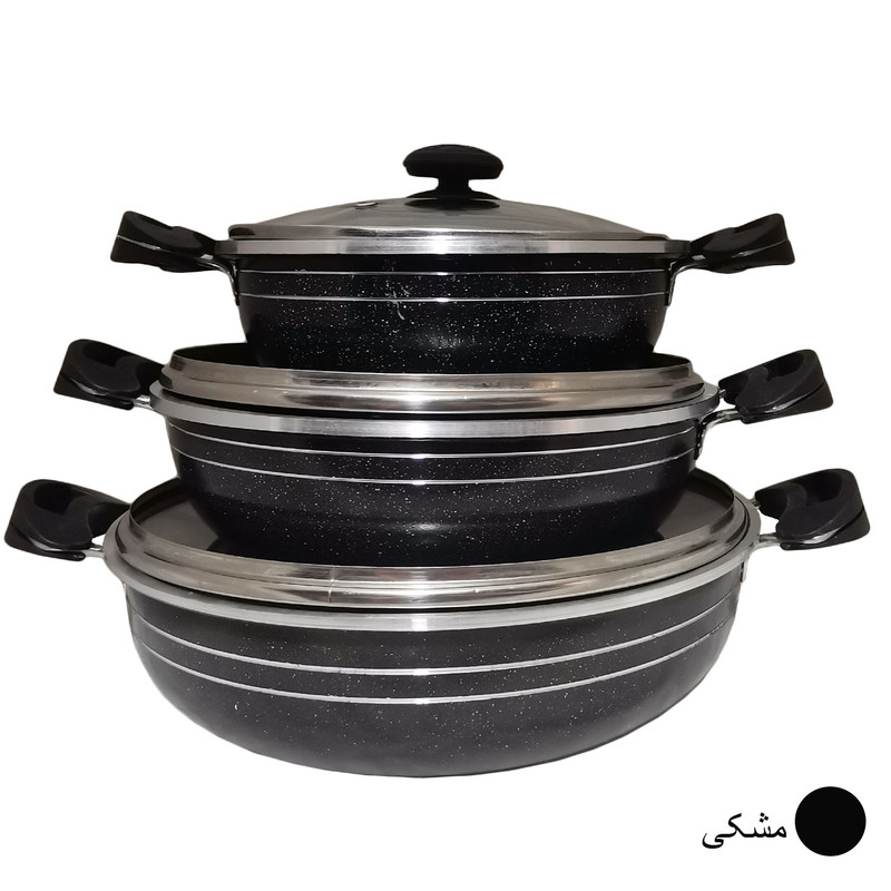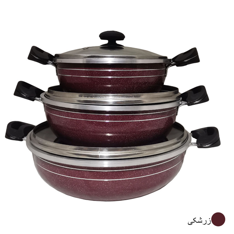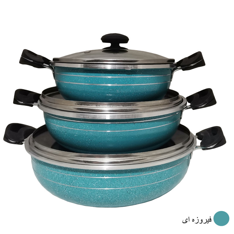 سرویس موجود شامل 3 تابه در سایزهای 20 و 24 و 28 و سه درب می باشد (منظور از سایز قطر دهانه ی تابه می باشد.) ساخته شده از آلومینیوم با کیفیت بالا که با روکش گرانیتی نچسب پوشانده شده است. قطر ورق بدنه از ضخامت بالایی برخوردار است که طبخ انواع غذا را فراهم میکند. دارای لبه های برجسته (طرح چدن) می باشد که هم کیفیت محصول را بالا برده و هم از نظر ظاهری به آن جلوه داده است.