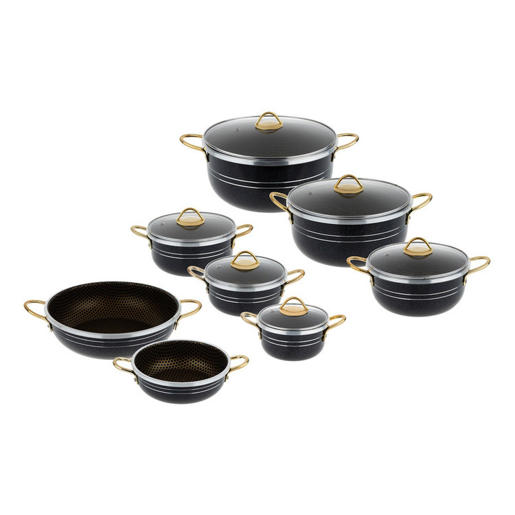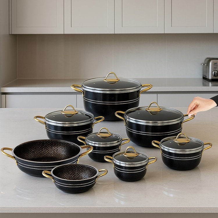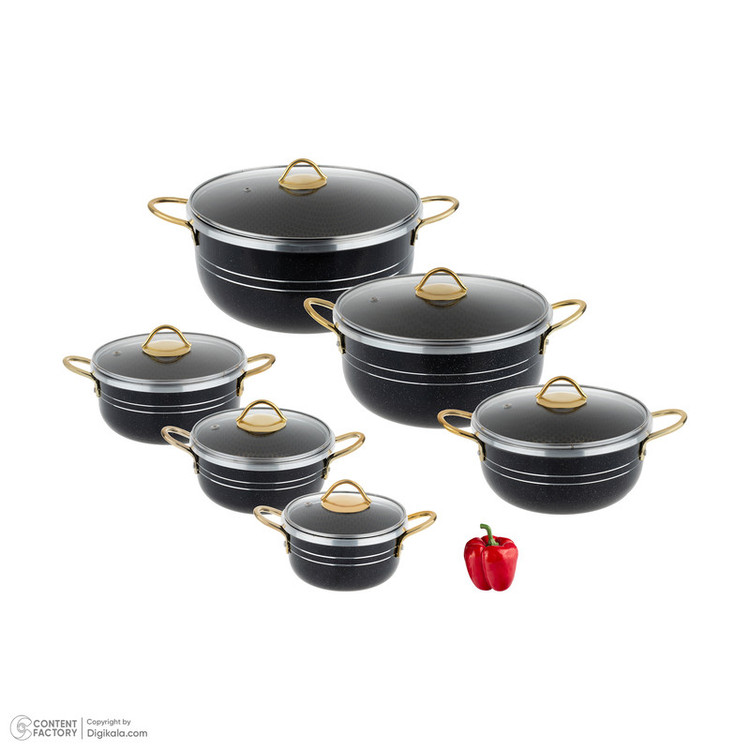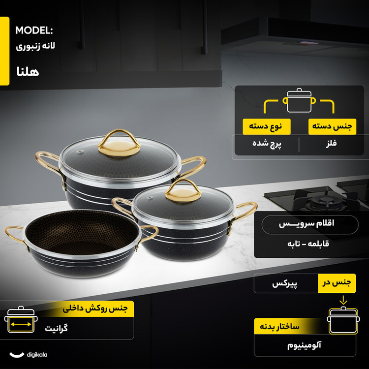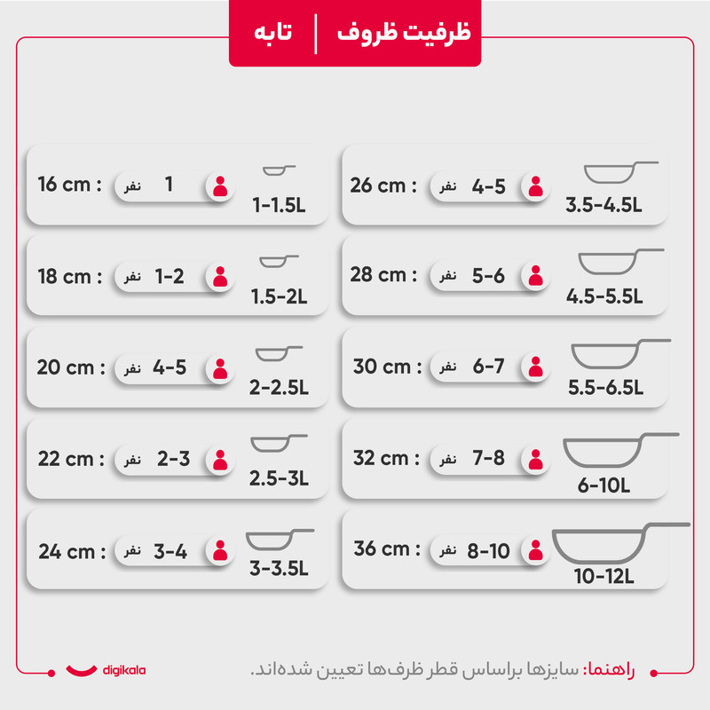 وزن ظروف: قابلمه سایز ۱۴: ۵۰۰ گرم، قابلمه سایز ۱۶: ۶۲۵ گرم، قابلمه سایز ۱۸: ۶۸۵ گرم، تابه سایز ۱۸: ۳۳۰ گرم، قابلمه سایز ۲۰: ۹۰۵ گرم، قابلمه سایز ۲۴: ۱۲۳۵ گرم، قابلمه سایز ۲۸: ۱۶۳۰ گرم، تابه سایز ۲۸: ۶۹۰ گرم