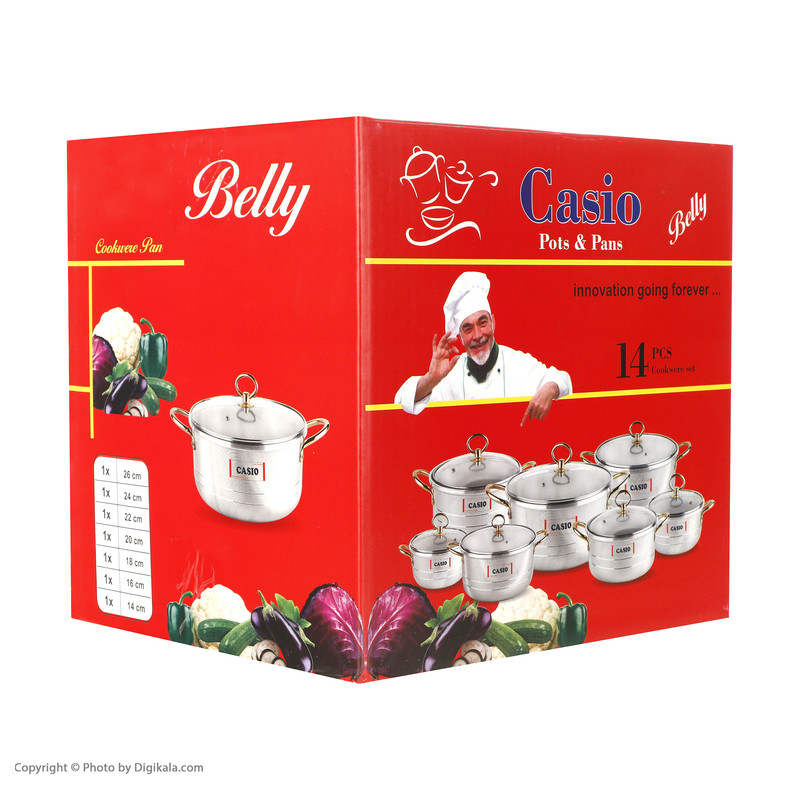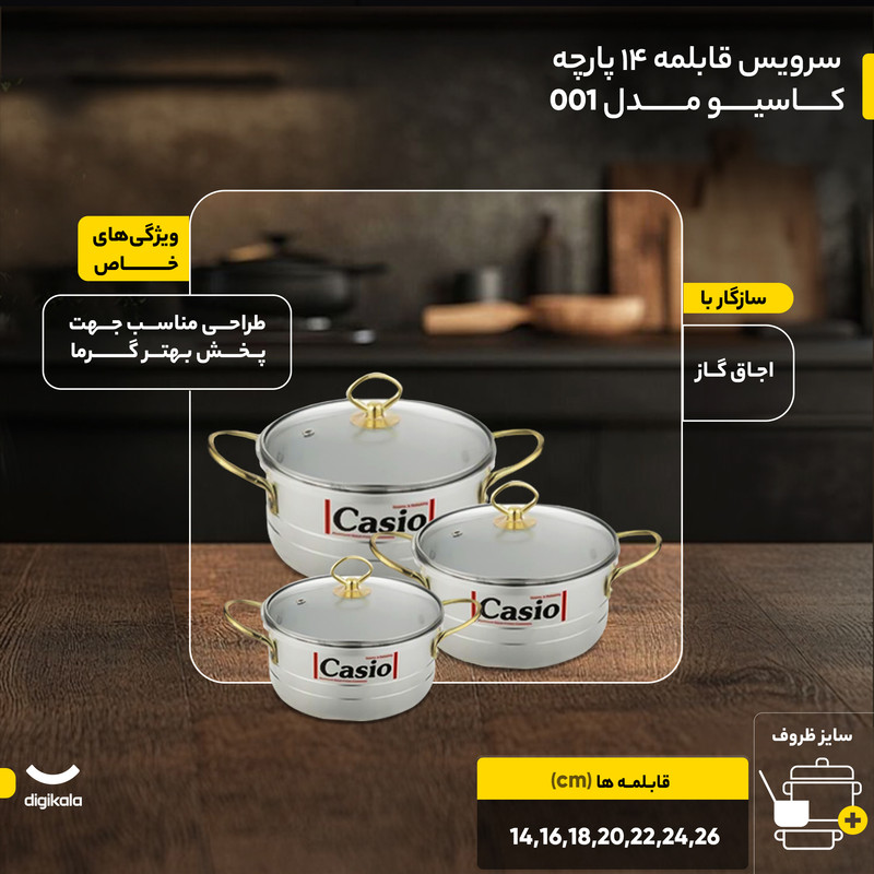 وزن ظروف: قابلمه سایز 14: 310 گرم، قابلمه سایز 16: 350 گرم، قابلمه سایز 20: 560 گرم، قابلمه سایز 22: 610 گرم، قابلمه سایز 24: 690 گرم، قابلمه سایز 26: 730 گرم