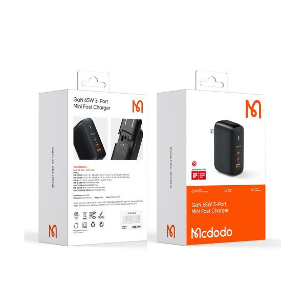 شارژ دیواری فست شارژ 65 وات GaN3 مک دودو برنده جایزه بهترین طراحی RedDot 2021 با بهرهمندی از تکنولوژی جدید مواد نیمه هادی گالیوم نیترید (GaN)، از جمله ویژگیهای این ماده میتوان به پهنای باند بالا، رسانا گرمایی زیاد، مقاومت گرمایی زیاد، مقاومت تابشی، مقاومت در برابر اسید و قدرت و استحکام بالا اشاره کرد؛ که مک دودو با توسعه و استفاده از این تکنولوژی توانسته شارژری هم اندازه شارژرهای فعلی ولی با قدرت بسیار بیشتری را تولید کرده است.