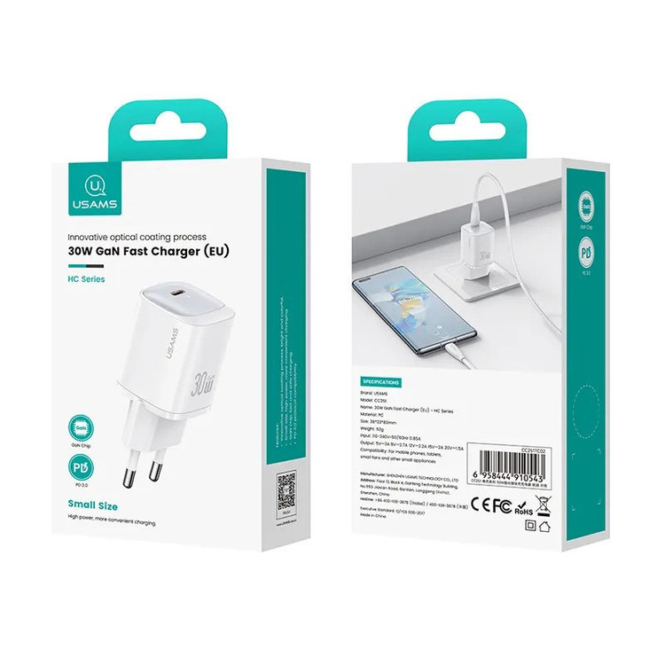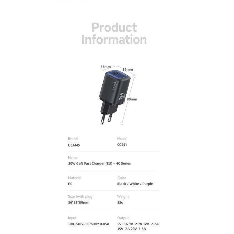 شارژر دیواری یوسمز مدل CC251 یک شارژر با کیفیت از برند یوسمز میباشد که از فناوری شارژ سریع PD بهره میبرد. شارژر دیواری usams با توجه به داشتن یک پورت تایپ سی – typec یک شارژ فست شارژ میباشد که شما میتوانید از آن استفاده کنید. این شارژر دارای ابعاد 36x33x811 میلیمتر و وزن 53 گرم میباشد که ابعاد کوچی نسبت به شارژهای هم رده خود است. شارژر یوسمز مناسب برای انواع گوشی آیفون مدل 8 به بالا و انواع گوشی در برندهای دیگر میباشد. این شارژ فست شارژ با توجه به اینکه یک چیپ هوشمند در آن به کار رفته، باعث شده زمانی که گوشی شما شارژ میشود از نوسانات برق جلوگیری کند تا به گوشی شما آسیب نرسد و یک شارژ ایمن به گوشی شما میدهد.