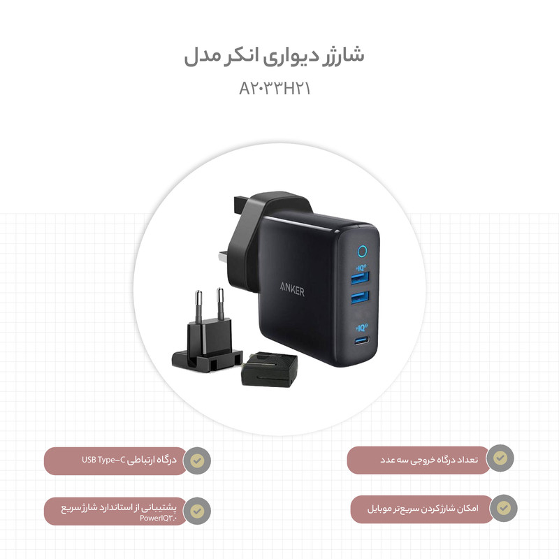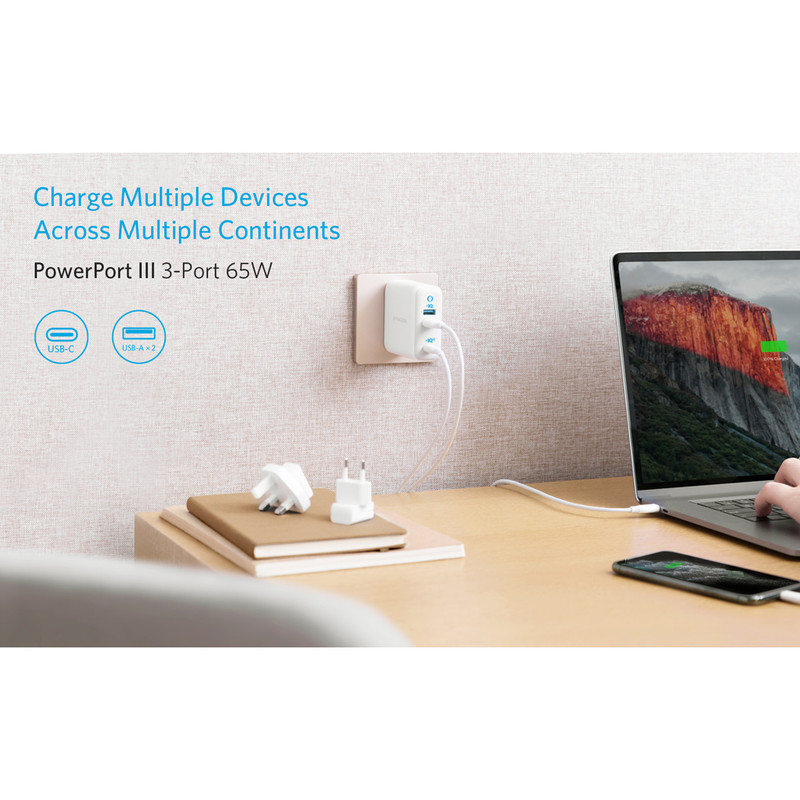 بدون شک یکی از پرمصرفترین لوازم جانبی گوشیهای هوشمند و تبلتها، شارژر است و اگر در خرید یک شارژر به معیارهای مهمی توجه نکنید، ممکن است در مدت کوتاهی دیگر آنطور که باید و شاید از خرید خود راضی نباشید. شرکت انکر اما در این زمینه تا به امروز توانسته است عملکرد بسیار خوب و کاملا قابل قبولی را بهنمایش بگذارد. POWERPORT III 3PORT 65W A2033 یکی از شارژرهای دیواری بسیار باکیفیت این شرکت است که با توجه به سه خروجی در نظر گرفته شده، توانایی شارژ سه دستگاه بهصورت همزمان را دارد. دو پورت USB-A و یک پورت USB-C برای این شارژر دیواری در نظر گرفته شده. توان 65 واتی در نظر گرفته شده برای این شارژر دیواری سبب شده تا مدت زمان کمی را برای شارژ گوشی یا تبلت خود از دست دهید. سه شاخه قابل تعویض برای این شارژر دیواری در نظر گرفته شده و همین امر سبب شده تا POWERPORT III 3PORT 65W A2033 بسیار مناسب برای مسافرتهای بینالمللی باشد. این شارژر دیواری هم از استاندارد فناوری شارژ سریع PowerIQ 3.0 پشتیبانی میکند.