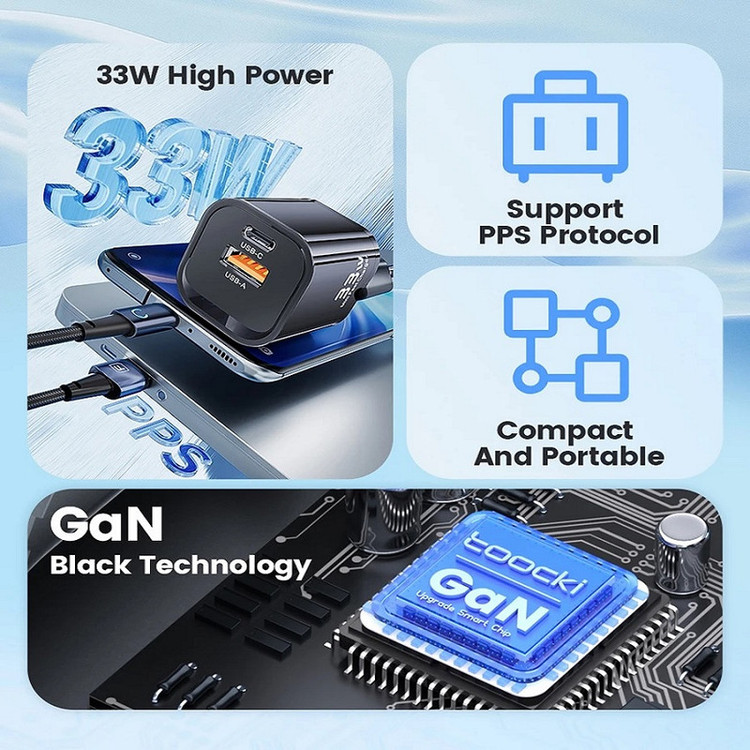 شرکت Toocki یکی از تولید کنندههای خوشنام تجهیزات شارژ سریع تلفن همراه، تبلت، لپتاپ از جمله کابل و شارژر میباشد که اخیرا خود را در میان برندهای سطح بالای این صنعت مطرح کرده است. در حال حاضر محصولات این شرکت در بازارهای اروپا و امریکا به فروش میرسند. شارژر مدل TCTAC-JCBA01 که از طراحی زیبا و کیفیت بسیار بالایی برخوردار است، توانایی شارژ سریع 33 وات را داشته و دارای دو پورت خروجی Type C و Type A میباشد که از انواع گوشیها و دیگر تجهیزات الکترونیکی مانند تبلتها و ایرپادها پشتیبانی میکند. این شارژر دارای فناوریهای QC و PD می باشد و تمامی گوشیهای را که از این فناوریها بهره میبرند را پشتیبانی میکند. همچنین دارای انواع سیستمهای حفاظتی است که دستگاه شما را در برابر اتصال کوتاه، نوسان برق، حرارت، شارژ بیش از حد، جریان و ولتاژ اضافه محافظت میکند. مواد استفاده شده در ساخت این شارژر از نوع Fire Proof PC، آن را در برابر حریق و حرارت بالا بسیار مقاوم نموده است. یکی از مهمترین ویژگیهای این محصول بهرهگیری از فناوری GaN می باشد و استفاده از ماده Gullium Nitride به عنوان یک ماده نیمه رسانای جدید که موجب انتقال بهتر انرژی و جلوگیری از اتلاف انرژی می شود و همچنین سایز این دستگاه را کوچک و حمل آن را راحتتر کرده است.