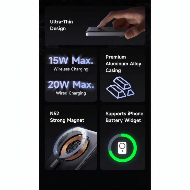 ابعاد: 16×65×104 میلیمتر وزن: 188 گرم ظرفیت اسمی: 10000 میلیآمپر ساعت جنس بدنه: آلیاژ آلومینیوم + ABS درگاه خروجی: تایپ C (حداکثر 20 وات) و پد شارژ وایرلس (حداکثر 15 وات)