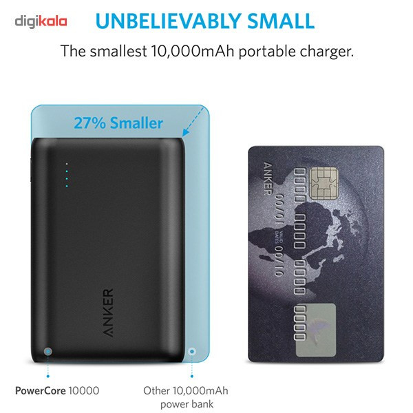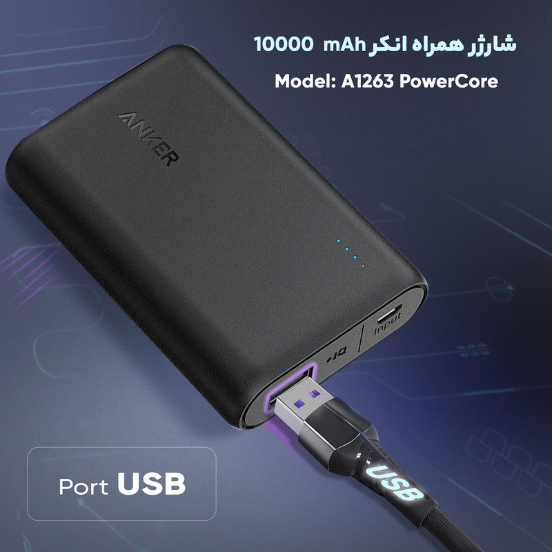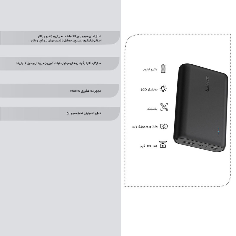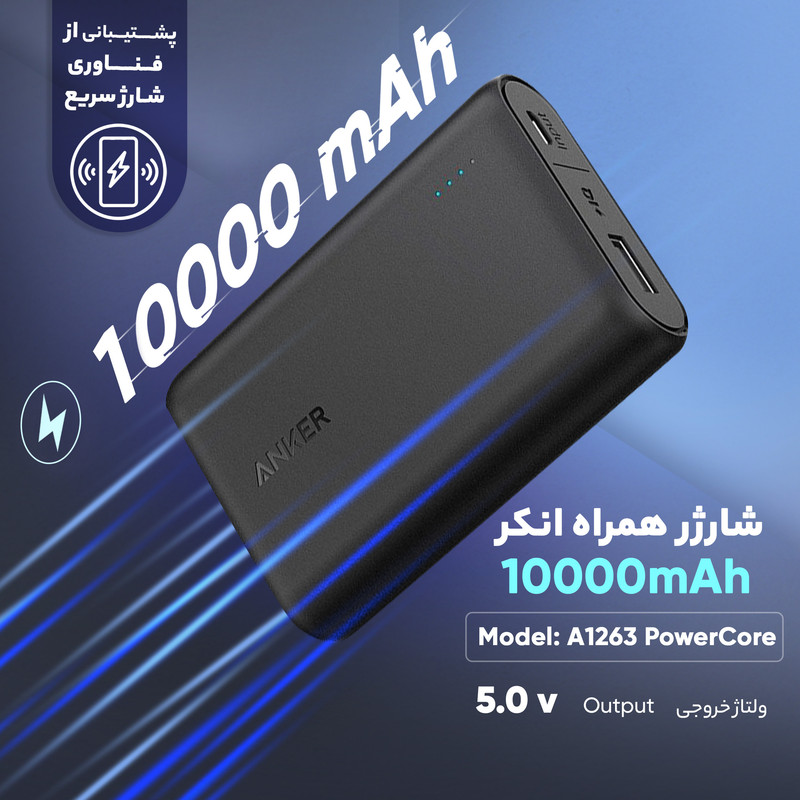 پاور بانک «انکر» مدل «A1263 PowerCore» با ظرفیت 10000 میلیآمپر ساعت تولید شده است. باتری به کار رفته در این محصول از نوع لیتیومی بوده و قابلیت شارژ انواع گوشیهای موبایل، تبلت، دوربین دیجیتال و موزیک پلیرها را دارد. در طراحی این محصول تنها یک درگاه خروجی در نظر گرفته شده است که شدتجریان خروجی در آن 2.4 آمپر است. شرکت تولیدکننده بدنه این محصول را بهگونهای تولید کرده که در برابر خطوخش مقاوم است؛ بنابراین میتوانید بدون نگرانی این شارژر همراه را بر روی سطوح مختلف قرار دهید و دیگر نگران بدنه پاور بانک خود نباشید. بر روی بدنه پاوربانک A1263 PowerCore نشانگرهای LED میزان شارژ تعبیه شده است که با نمایش وضعیت شارژ پاور بانک به کاربران در تنظیم فعالیتشان کمک فراوانی خواهد کرد. این محصول 170 گرم وزن دارد و میزان ولتاژ ورودی و خروجی در آن 5 ولت است. یکی از ویژگیهای مهم این محصول، پشتیبانی از تکنولوژی شارژ سریع QI است که شارژدهی این پاور بانک را تا حد قابلتوجهی افزایش داده است. همچنین این محصول در برابر افزایش ولتاژ، دما و جریان محافظت شده است که میتوانید از ایمنی شارژر همراه خود به هنگام بروز مشکلاتی از این دست اطمینان حاصل کنید. برخورداری از ویژگیهای ذکر شده و همچنین ظرفیت 10000 میلیآمپر ساعتی این محصول میتواند توجه بسیاری از کاربران را به خود جلب کند.