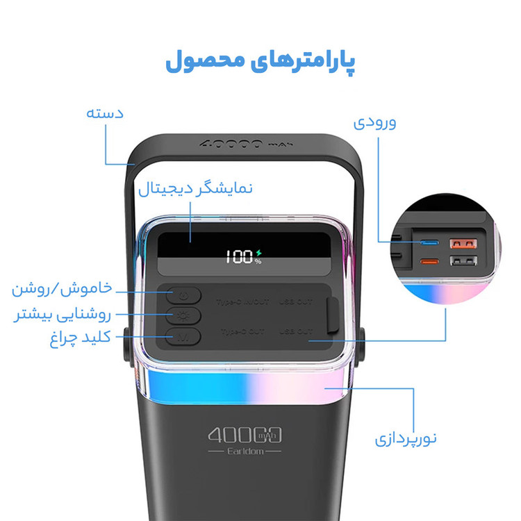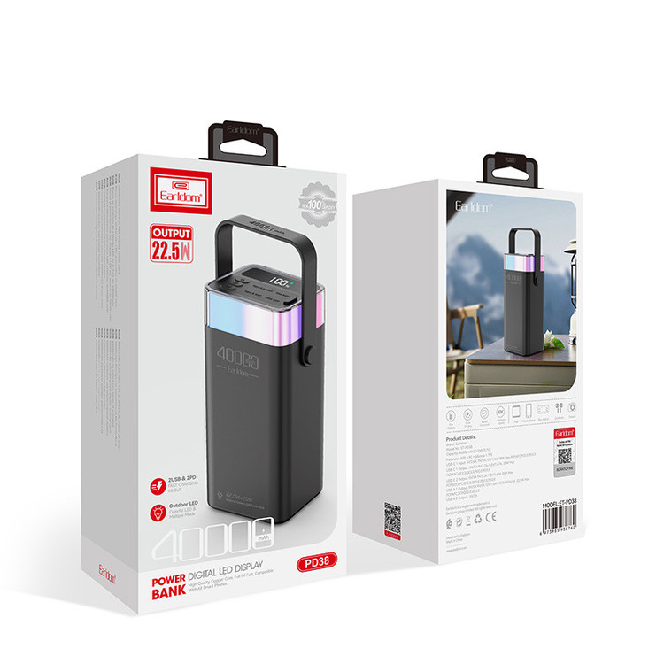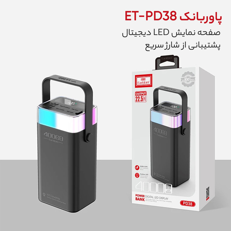اغلب در زندگی روزمره، در یک لحظه غیرمنتظره، ممکن است شارژ گوشی شما تمام شود، یک باتری خارجی Earldom ET-PD38 با ظرفیت 40000 میلی آمپر وجود دارد که برای این راه حل مناسب است. مجهز به نشانگر LED برای نظارت بر میزان شارژ. با داشتن پاوربانک، لازم نیست برای شارژ دستگاه های الکترونیکی خود به پریزهای برق تکیه کنید. شما می توانید دستگاه های خود را در هر مکان و هر زمان با پاوربانک Earldom ET-PD38 شارژ کنید.