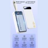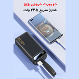 یک ویژگی مهم و جذاب این پاوربانک چراغ LED هست که در پشت این دستگاه تعبیه شده است. این چراغ قدرتمند دارای نور درخشان و با قدرت بالایی است که در مکان های تاریک به شدت کمک حال شما خواهد بود. ویژگی بعدی این پاوربانک استفاده از بند محکم در قسمت بالایی دستگاه است که به راحتی و بدون نگرانی از پارگی میتوانید پاوربانک را جابه جا کنید. این پاوربانک دارای دو پورت خروجی USB-A با توان 22.5 وات و یک پورت Type-C با ماکزیمم توان 20 وات است و از فناوریهای شارژ سریع PD و QC نیز پشتیبانی میکنند. و همچنین قابلیت شارژ همزمان سه دستگاه را نیز داراست. ورودی های این پاوربانک از دو نوع Type-C و Micro با قابلیت شارژ سریع 18 وات می باشد که این ویژگی مهم در شارژ کردن پاوربانک بسیار موثر است. میزان شارژ این دستگاه از طریق نشانگر دیجیتالی است که روی آن تعبیه شده است و میتوانید در هر لحظه میزان شارژ دستگاه را مشاهده نمایید.