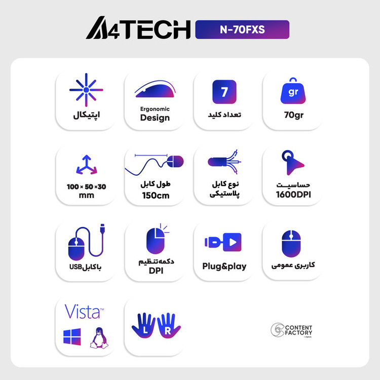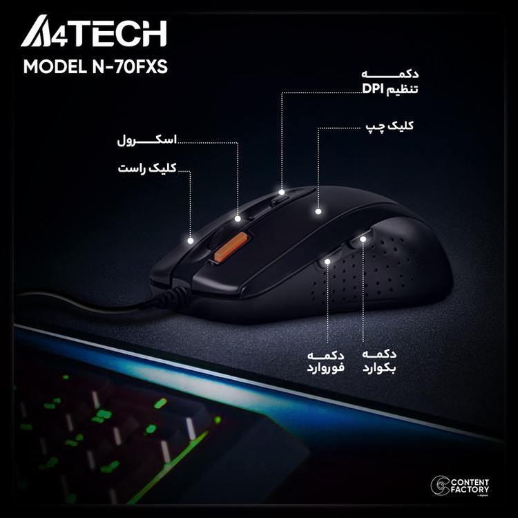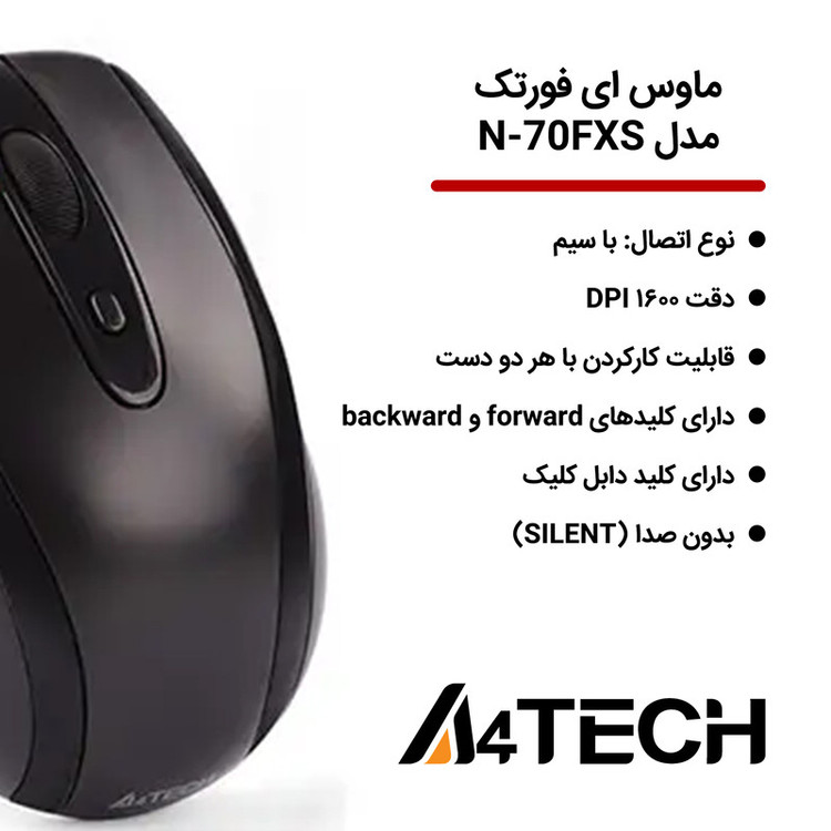 ای فورتک (A4TECH) یک شرکت تایوانی معتبر در زمینه تولید تجهیزات کامپیوتری و همچنین گیمینگ است که محصولاتش با استانداردهای جهانی سازگار هستند و در جهان طرفداران ویژهای دارند. ماوسای فورتک مدل N-70FXS یک ماوس بیسیم است که اتصال آن از طریق فرکانس 2.4 گیگاهرتزی انجام میشود. این اتصال بیسیم به کاربر این امکان را میدهد که بدون هیچ محدودیتی از فاصله دور هم از ماوس استفاده کند. برای شارژ کردن ماوس ای فورتک مدل N-70FXS، ابتدا کابل شارژر USB به پورت مخصوص ماوس و سپس به پورت USB کامپیوتر یا لپتاپ متصل میشود. مدت زمان لازم برای شارژ کامل این ماوس حدود 2 تا 3 ساعت است.