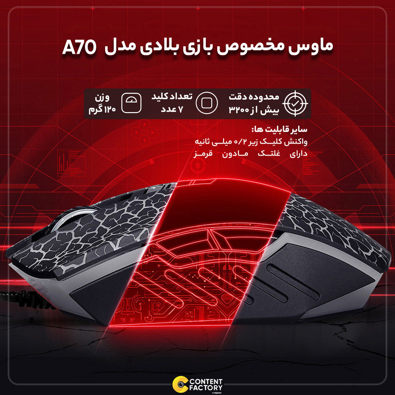 موس گیمینگ بلادی مدل A70 یک موس گیمینگ جذاب ساخته شده توسط کمپانی بلادی است.این موس گیمینگ جذاب به صورت اختصاصی برای گیمیر ها ساخته شده است و دارای طول عمر بیشتری نسبت به یک موس معمولی دارد.طراحی جذاب این موس به صورت یک صاعقه است که هنگام استفاده از آن احساس میکنید یک سلاح قدرتمند و قوی را در دست دارید که با آن میتوانید تمام دشمنان خود را در بازی شکست دهید.کلید های 1 , 3 , N بر روی موس قابل تنظیم بوده و این امکان را به شما میدهد که حالت های مختلف تیراندازی را با آن تنظیم کنید و با کلید های کناری موس امکان تعویض اسلحه و … را نیز دارید .