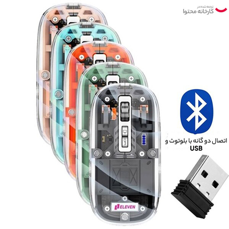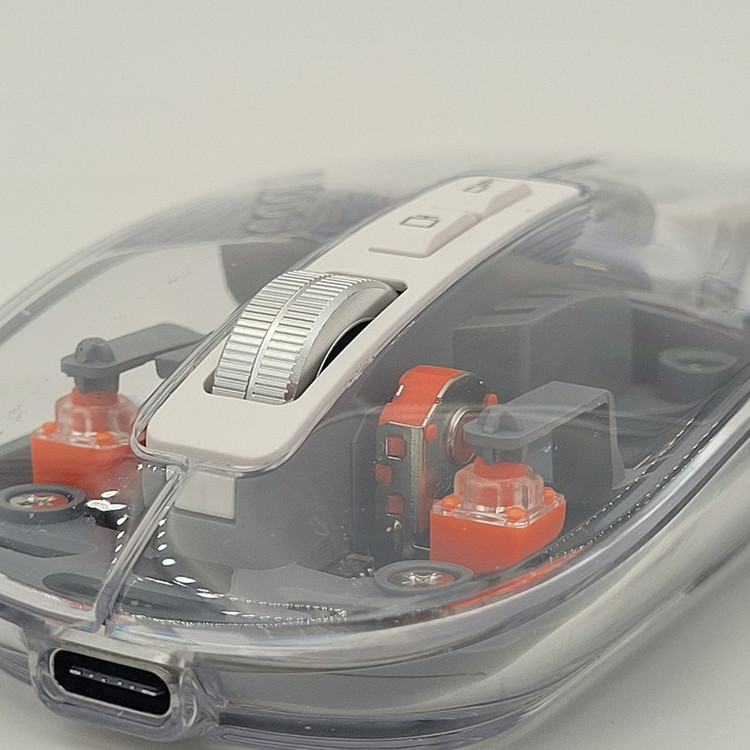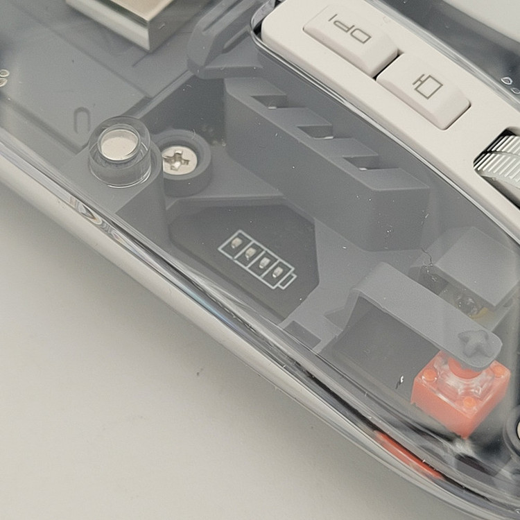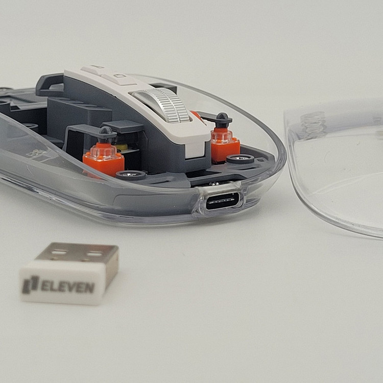 رویه این ماوس شیشه ایی هستش و داخل ماوس به زیبایی قابل دیدن هستش که به عنوان درب هم استفاده میشود و به صورت مگنتی وصل میشود تا عمر زیادی داشته باشد بعد از باز کردن آن شما میتوانید دانگل گیرنده را داخلش بگذارید تا خیالتان از گم شدن راحت باشد.