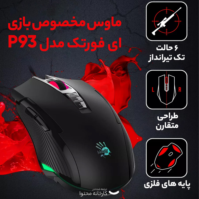 ماوس «P93» طراحی شده از شرکت «ای فورتک» است.این موس قابلیت جلوگیری از لرزش دست هنگام تیر اندازی را دارد به طوریکه این امکان را در اختیار کاربر قرار میدهد تا در بازیهای اکشن به راحتی بتوانند هدف را مورد اصابت گلوله قرار بدهند همچنین شما قابلیت این را دارید تا رزولوشن این موس را تا 5000 DPI کنترل کنید و همچنین این موس دارای چراغ ال ای دی در سه رنگ مختلف است.