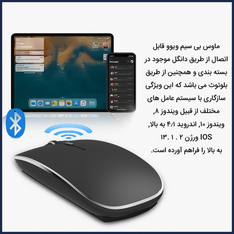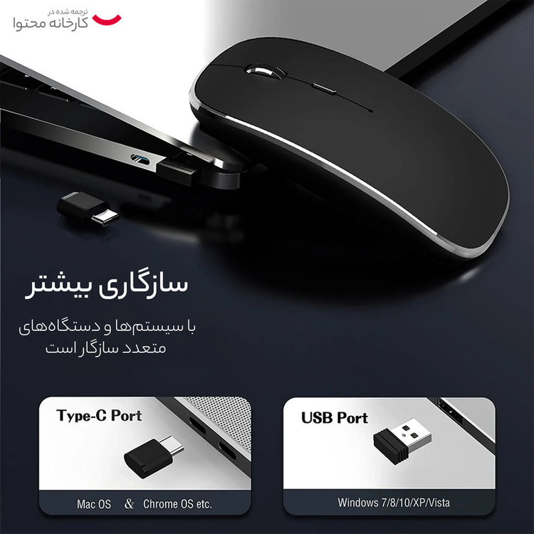 این ماوس هم برای استفاده انواع لپ تاپ و کامپیوتر طراحی شده و هم برای گوشی ها موبایل و تبلت. یه دانگل در زیر ماوس قرار داره که باید اون و به درگاه USB کامپیوتر وصل کنین. ولی برای متصل شدن به موبایل و یا تبلت نیازی به این دانگل و برنامه ی خاصی نیست و اتصال از طریق بلوتوث انجام میشه. فقط نکته قابل توجه برای دستگاه های اپل اینه که قبل از اتصال می بایست وارد تنظیمات شده و از منوی Accessbility وارد شده و سپس AssistiveTouch را روشن کنید تا دکمه مجازی فعال بشه. حال می تونید از منوی بلوتوث ماوس را با نام BT5.1 Mouse پیدا کرده و به آن متصل بشید. ولی برای دستگاه های اندروید نیاز به برنامه و تنظیمات خاصی نیست.