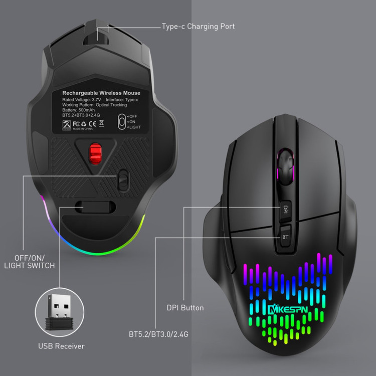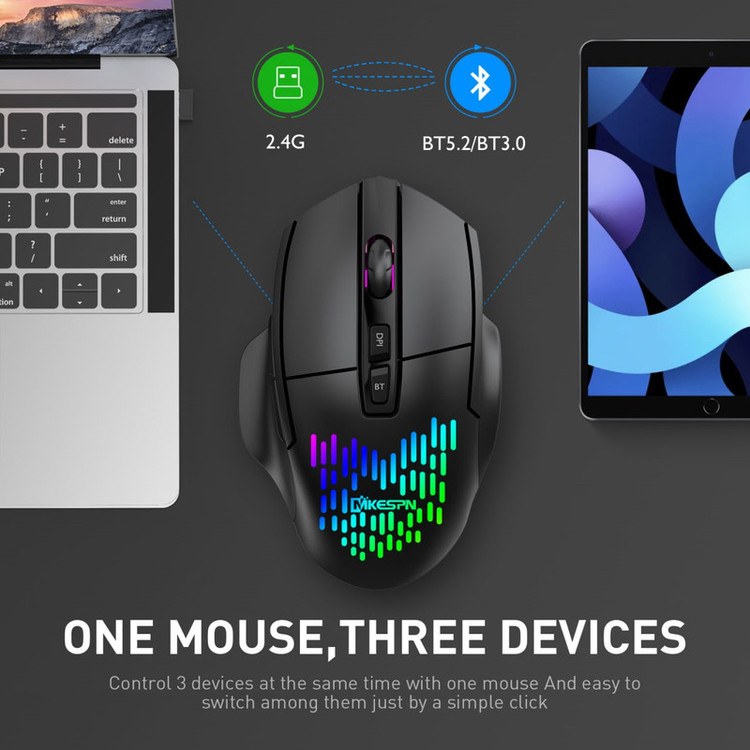از خصوصیات این ماوس میتوان به اتصال از دو طریق بلوتوث و دانگل،داشتن کلیکهای اصلی سایلنت و RGB خاص و منحصر به فرد اشاره کرد.همچنین باتری این ماوس از نوع داخلی و قابل شارژ میباشد.برای تغییر مود از بلوتوث به دانگل و برعکس کلید پایین تغییر DPI را حدودا 3 ثانیه نگهدارید.در صورتی که در اتصال از طریق بلوتوث مشکل داشتید و ماوس را در تنظیمات بلوتوث کامپیوتر پیدا نکردید کلیدهای راست کلیک و چپ کلیک و اسکرول را برای چند ثانیه با هم فشار دهید.