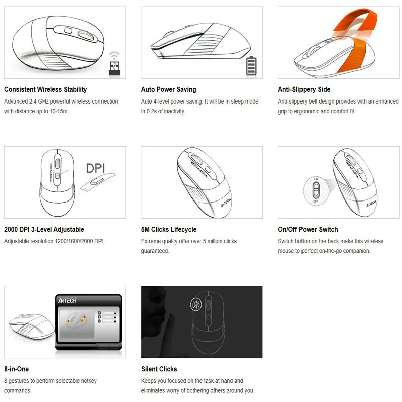 یک ماوس جذاب از برند محبوب و جهانی ای فورتک که دراری کمربند ضد تعریق جهت استفاده طولانی مدت است. این ماوس کاملا بیصدا است با دقت بسیار بالا. این ماوس قابلیت برنامه ریزی جهت سوهولت دسترسی را دارد.