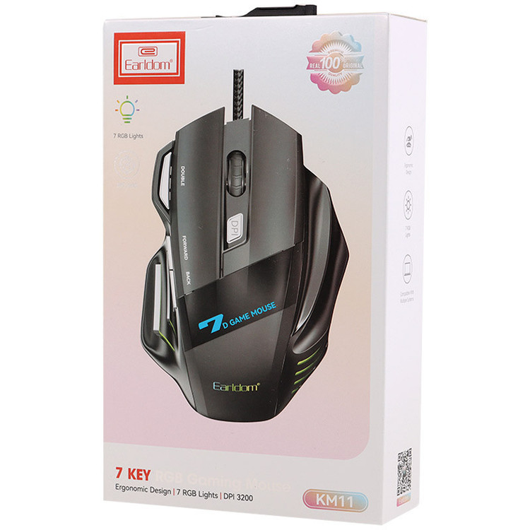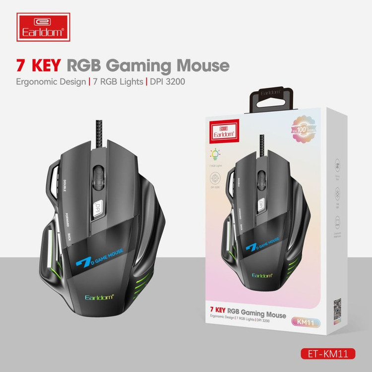 کابل KM11 به طول 1.5m با روکش کابل متصل از جنس الیاف بهم بافته شده است و بسیار مقاوم در برابر گره خوردگی و پارگی میباشد. همچنین مجهز به نورپردازی RGB جهت ایجاد جلوه بصری زیبا در محیط کم نور و تاریک نیز میباشد. بدنه ساخته شده از متریال پلاستیک ABS مقاوم در برابر فشار و ضربه و پشتیبانی از اتصال Plug And Play، دارای گواهی استاندارد CE/ FCC است. ماوس گیمینگ KM11 دارای 7 عدد کلید فیزیکی با میزان ضربه پذیری 3 میلیون بار کلیک و مجهز به حسگر اپتیکال با میزان دقت حداکثر 3200 نقطه بر اینچ نیز است . این ماوس خوش دست دارای طراحی ارگونومیک و اتصال باسیم توسط رابط USB است