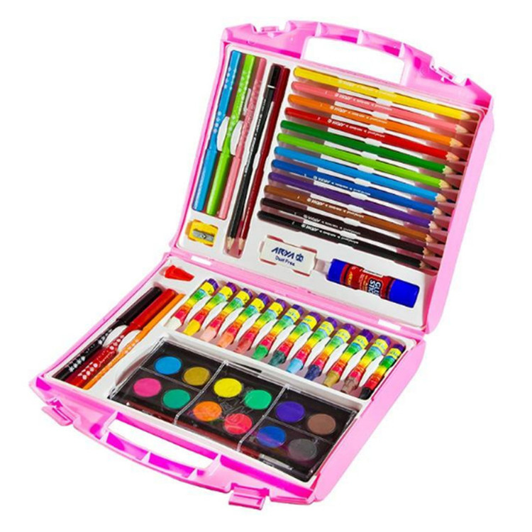 - 12 عدد مداد رنگی - 12 عدد پاستل - 12 عددابرنگ - 6 عدد ماژیک - یک عدد مداد مشکی - یک عدد مداد قرمز - دو عدد مداد تراش - یک عدد پاک کن - یک عدد قلم مو گواش - یک عدد چسب ماتیکی