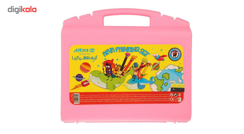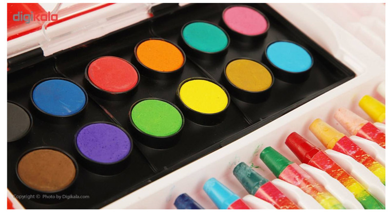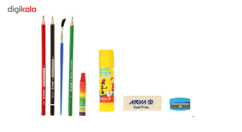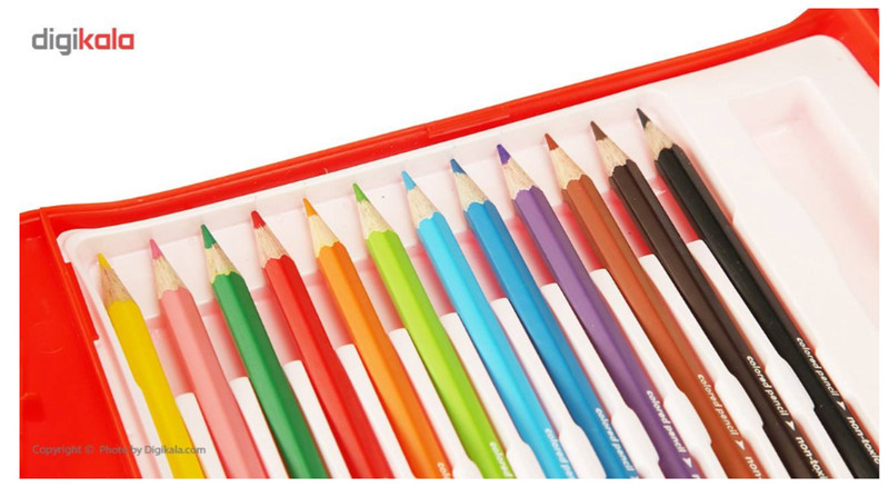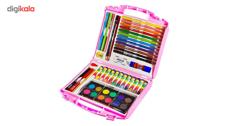 - 12 عدد مداد رنگی - 12 عدد پاستل - 12 عددابرنگ - 6 عدد ماژیک - یک عدد مداد مشکی - یک عدد مداد قرمز - دو عدد مداد تراش - یک عدد پاک کن - یک عدد قلم مو گواش - یک عدد چسب ماتیکی