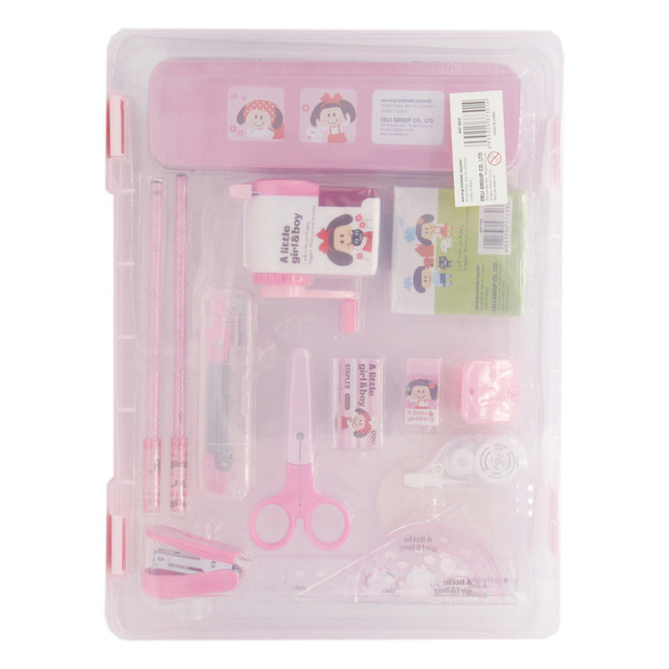 ست لوازم تحریر دلی دارای گونیا،پرگار،نقاله،قیچی،خطکش،جامدادی،پاک کن،مدادتراش،سوزن کش،مداد،منگنه و دفترچه یادداشت میباشد.