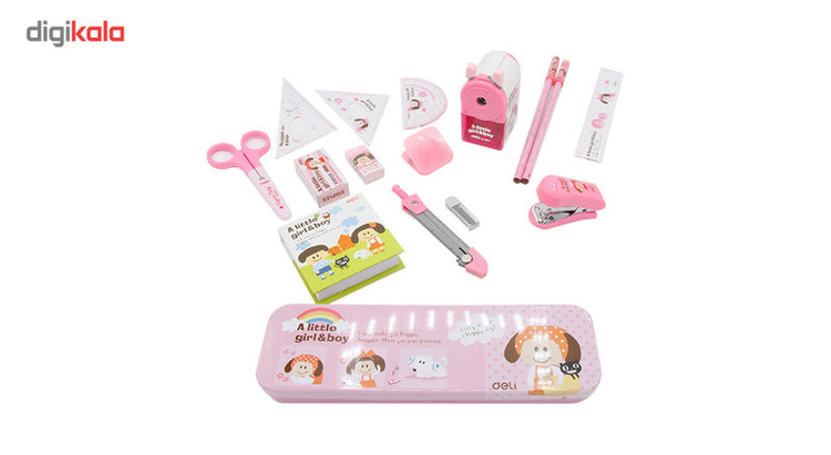 ست لوازم تحریر دلی دارای گونیا،پرگار،نقاله،قیچی،خطکش،جامدادی،پاک کن،مدادتراش،سوزن کش،مداد،منگنه و دفترچه یادداشت میباشد.