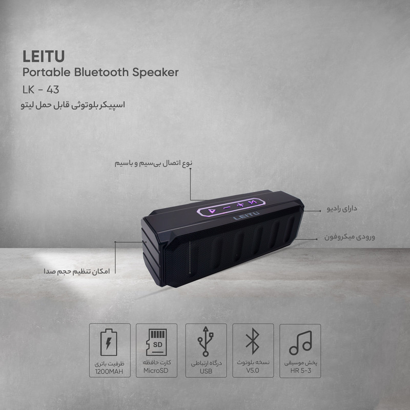 { LK – 43 } نام یکی از جدیدترین اعضای شرکت لیتو است که بهتازگی تولید و در ایران از آن رونمایی شد. در مورد ویژگیهای ظاهری این محصول جدید و مکعب شکل میتوان به زیبایی و منحصربهفرد بودن آن اشاره کرد که هنگام استفاده از آن باتوجهبه طراحی و رنگ مشکی یکدست بهکاررفته در ساخت آن، حس خوبی را به مصرفکننده القا میکند. عضو جدید خانواده لیتو یک صفحه کنترل به همراه الایدی رنگی دور آن بر روی بدنه خود دارد که باعث افزایش زیبایی ظاهری محصول شده است. در این صفحه کنترلی دکمههای پخش و توقف – صدا کم – صدا زیاد - تغییر حالت بر روی اسپیکر قرار گرفته است. در پشت دستگاه درگاه ورودی کابل شارژ – فلش - کارت حافظه –کابل AUX و دکمه پاور را میتوان مشاهده کرد، در قسمت جلوی اسپیکر نیز ستلایت یکتکه باقدرت پخش صدایی واضح و نسبتاً بلند همراه توری محافظ روی آن خودنمایی میکند. در بستهبندی به همراه اسپیکر کابل شارژر مخصوص و کابل aux موجود است. در زیر اسپیکر یک لاستیک جهت قراردادن آن روی سطح دلخواه و جلوگیری از لیز خوردن آن قرار گرفته است .