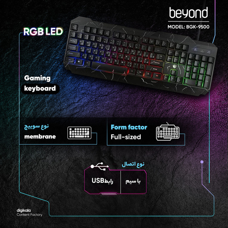 کیبورد مخصوص بازی بیاند مدل BGK-9500، سوییچ ممبران ، Full Size، نورپردازی LED RGB