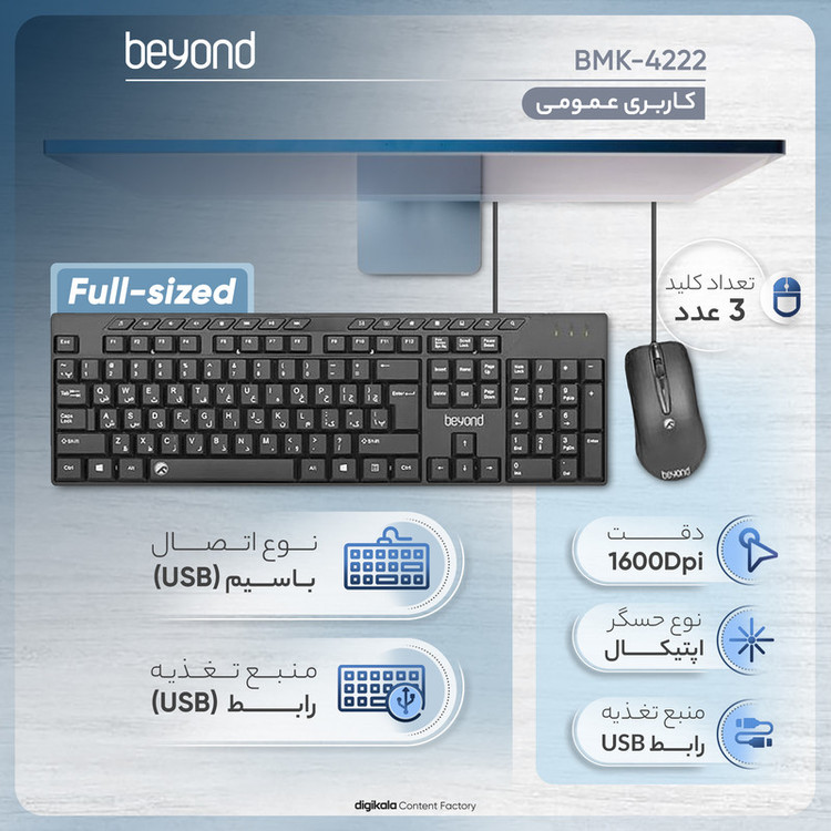 کیبورد و ماوس بیاند مدل BMK-4222، یک ست کاربردی و مقرونبهصرفه برای استفاده عمومی است که با طراحی ساده و عملکرد مناسب، نیازهای بسیاری از کاربران را برآورده میکند. کیبورد این مدل با ابعاد ۴۳۶ × ۱۳۷ × ۱۸ میلیمتر و وزن ۳۳۵ گرم، از نوع Full Size است و تمامی کلیدهای استاندارد را در خود جایداده است. این کیبورد از طریق کابل USB به سیستم متصل میشود و طول کابل آن ۱۳۰ سانتیمتر است که امکان جابهجایی و استفاده راحت را فراهم میکند. نوع سوئیچ این کیبورد از نوع ممبران است که تایپ نرم و بیصدا را ممکن میسازد. همچنین حروف فارسی حک شده روی کلیدها، استفاده از آن را برای کاربران آسانتر میکند. این کیبورد دارای پایههای قابلتنظیم است که میتوان آن را به ارتفاع موردنظر تنظیم کرد تا تایپ راحتتری داشته باشید.