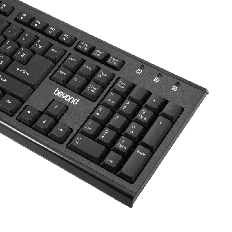 کیبورد و ماوس بیاند (کمبو) BMK-8320 RF از طریق اتصال گیرنده وایرلس USB به دستگاه متصل میشود. تعداد کلیدهای کیبورد 104 عدد است و دارای کلیدهای ترکیبی یا Function Keys میباشد.